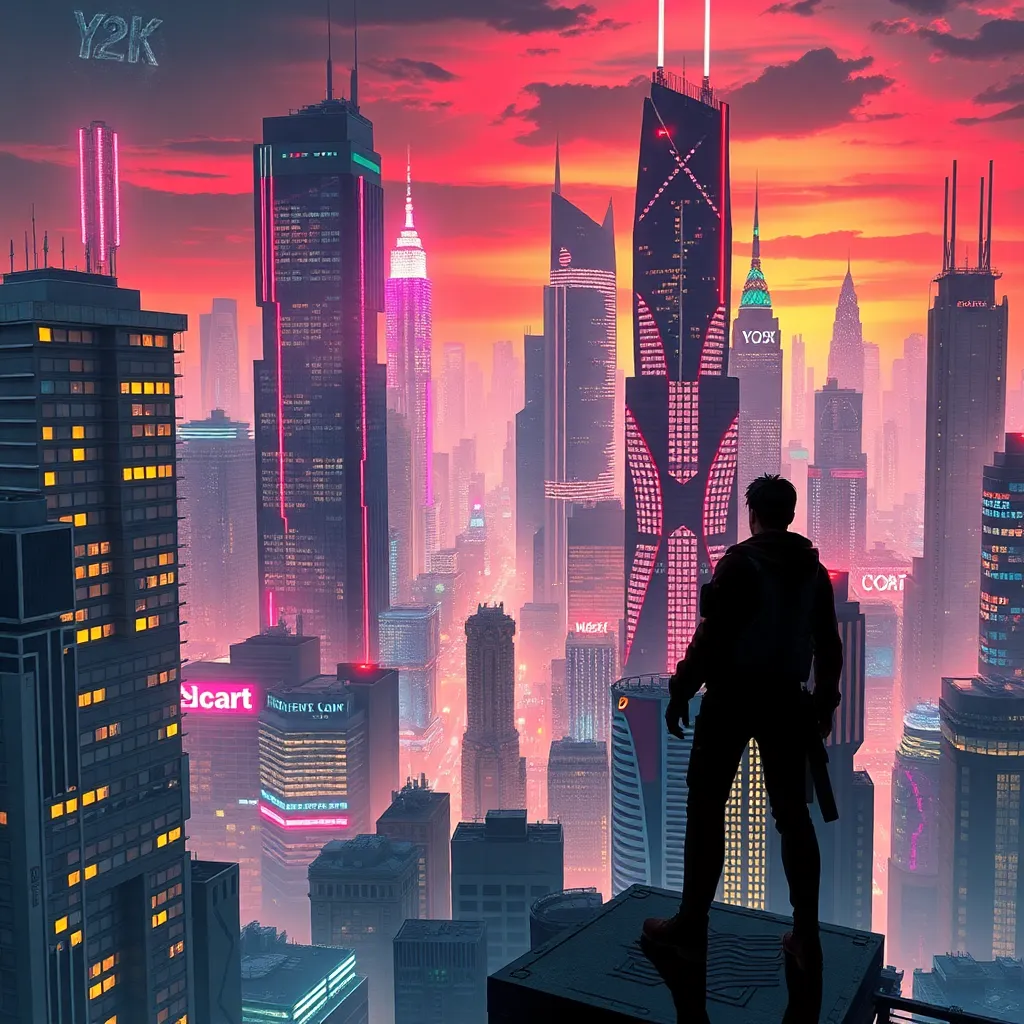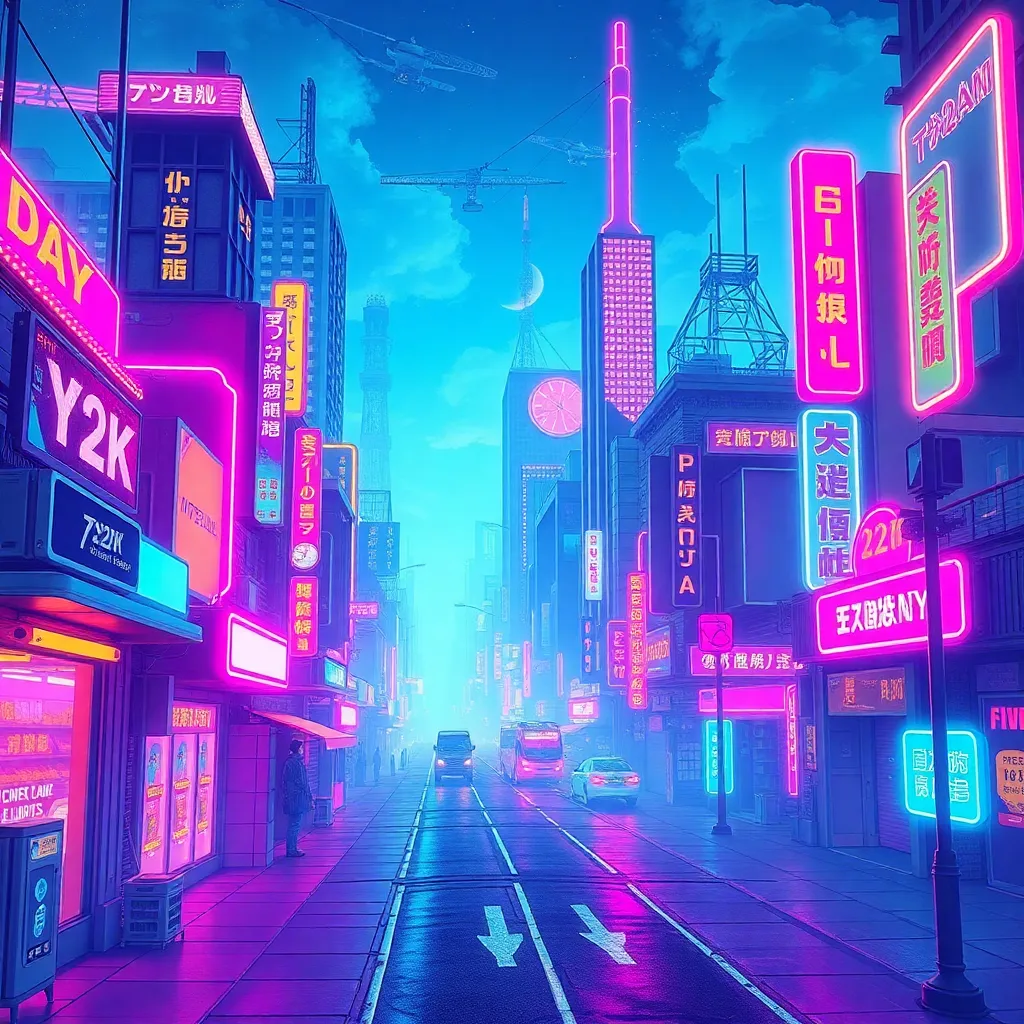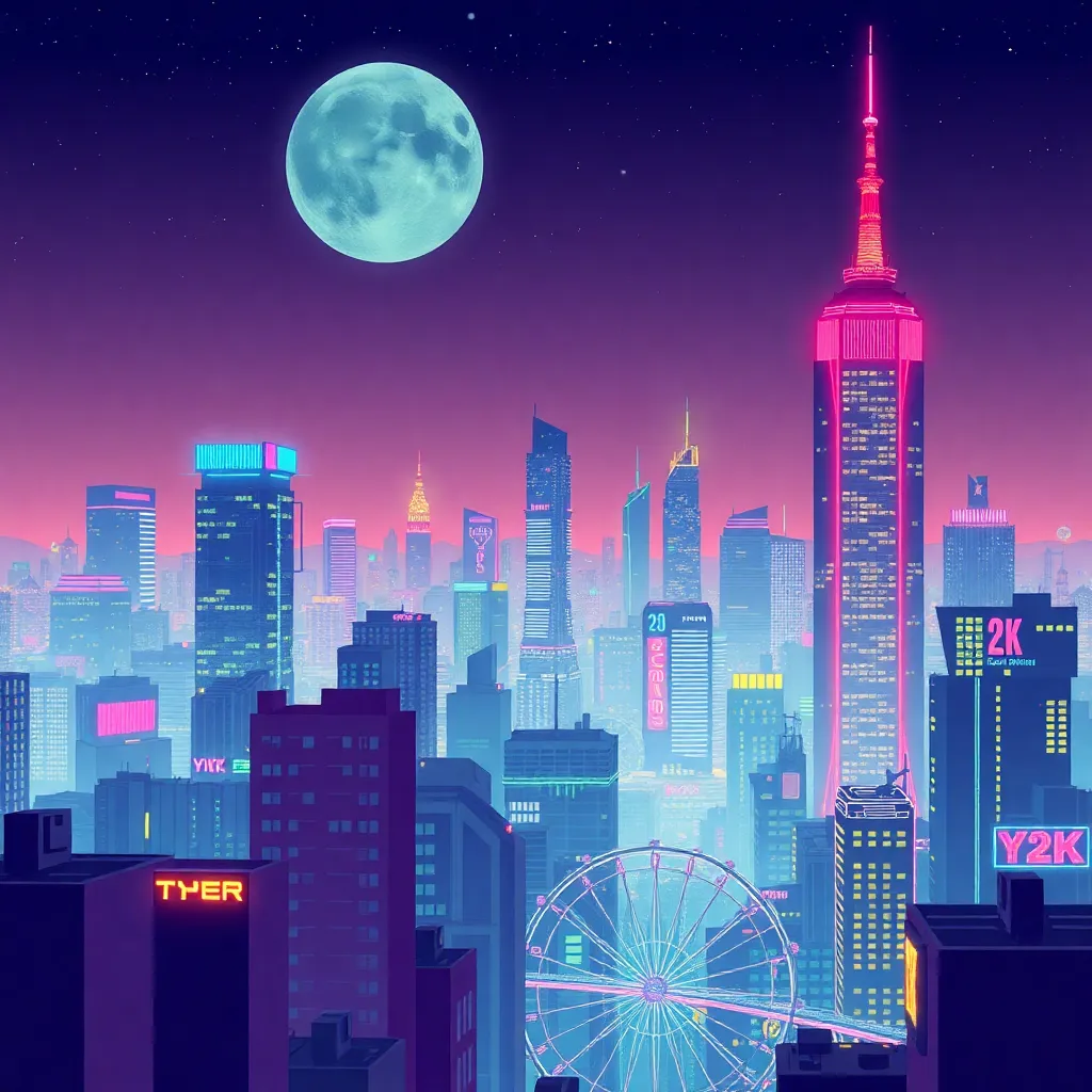 Create a futuristic cityscape with a retro twist, inspired by the Y2K era. Incorporate neon lights, pixelated skyscrapers, and a hint of nostalgia. Imagine a world where technology and nostalgia collide, with a dash of cyberpunk flair. Use vibrant colors and bold lines to bring this retro-futuristic scene to life.