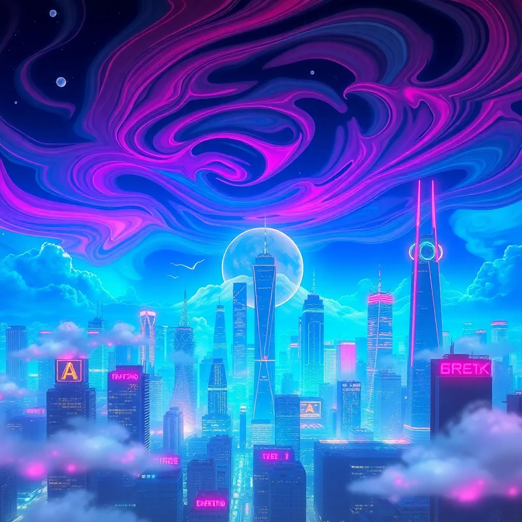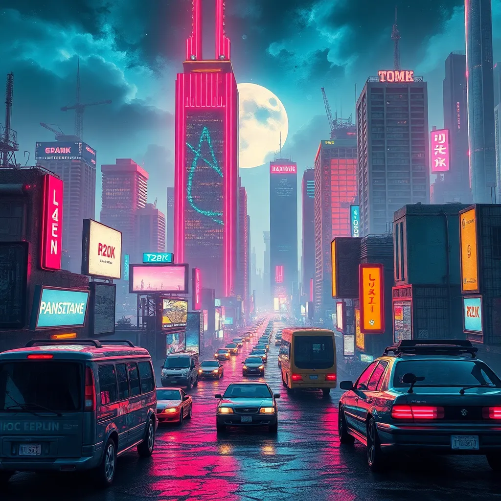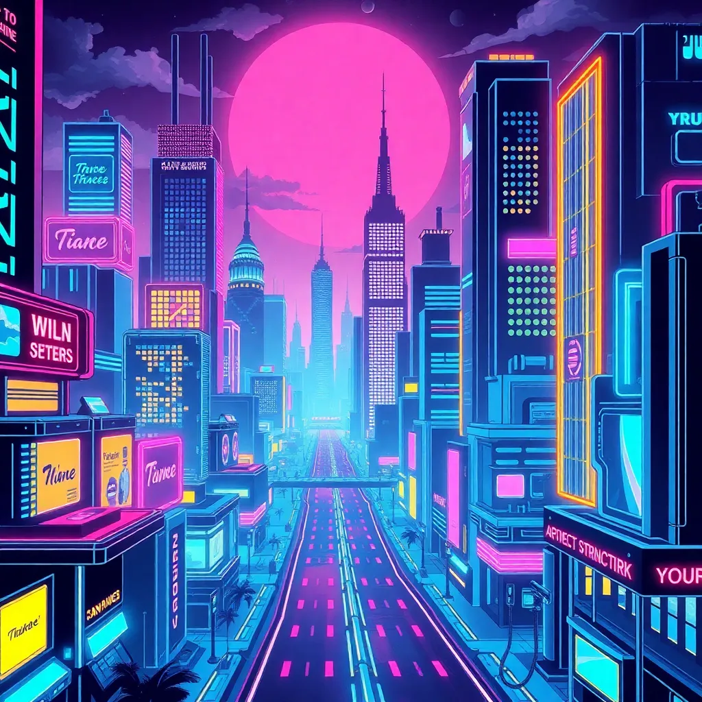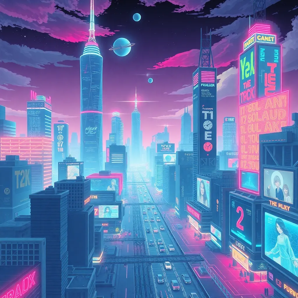 Create a futuristic cityscape with a retro twist, inspired by the Y2K era. Incorporate neon lights, pixelated skyscrapers, and a hint of nostalgia. Imagine a world where technology and nostalgia collide, with a dash of cyberpunk flair. Use vibrant colors and bold lines to bring this retro-futuristic scene to life.