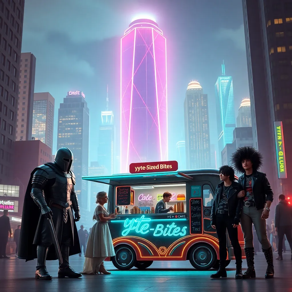 Create a futuristic cityscape with a neon-lit, holographic skyscraper in the background. In the foreground, a group of people from different eras, including a medieval knight, a Victorian-era lady, and a 1980s-style punk rocker, are gathered around a retro-futuristic food truck serving 'yte-Sized Bites'.
