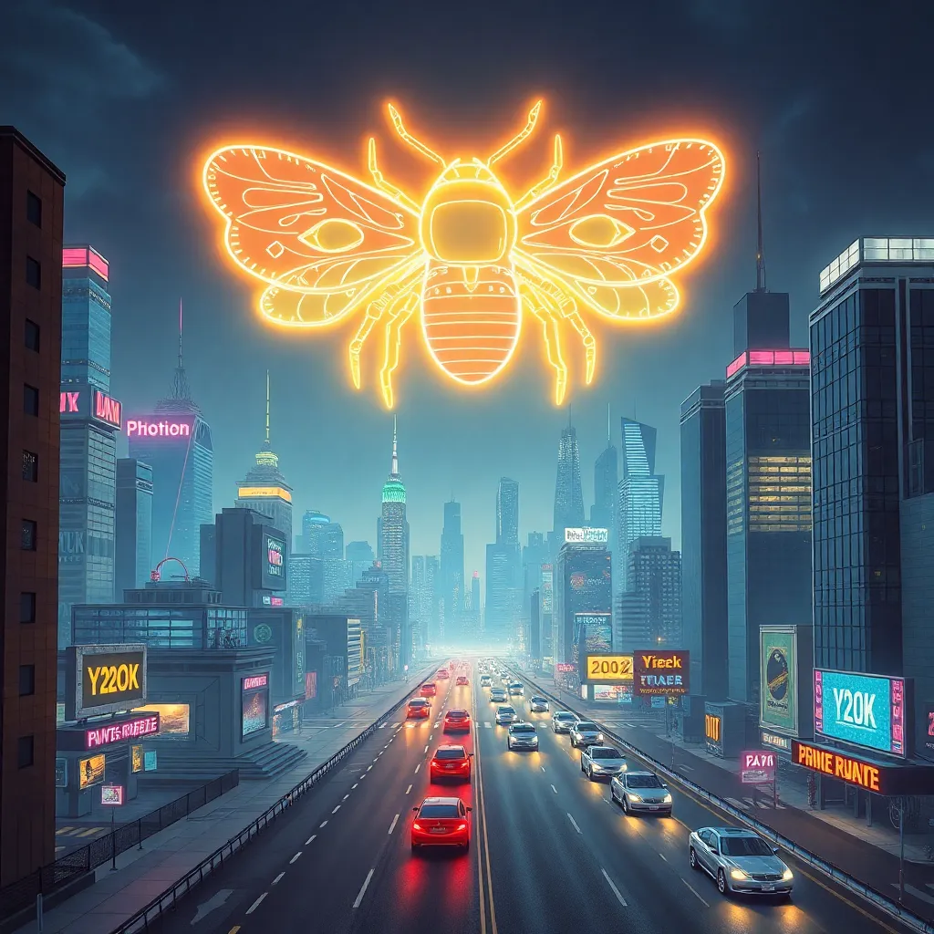 Create a futuristic cityscape from the year 2000, featuring a sleek, neon-lit skyscraper with a giant, glowing 'Y2K Bug' logo on its side. Incorporate retro-futuristic elements like hoverboards, flying cars, and pixelated graphics. Add a dash of nostalgia with a familiar landmark, like the Eiffel Tower or the Golden Gate Bridge.