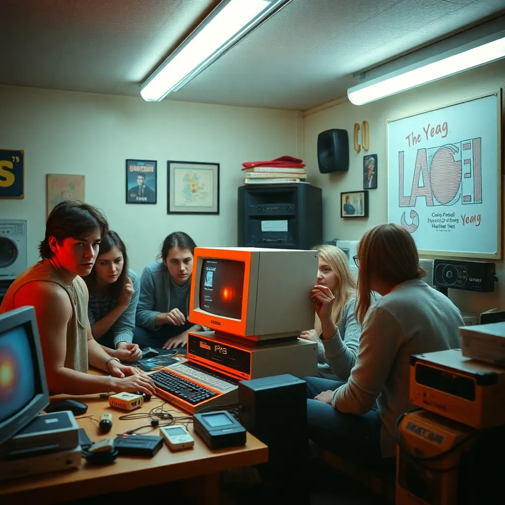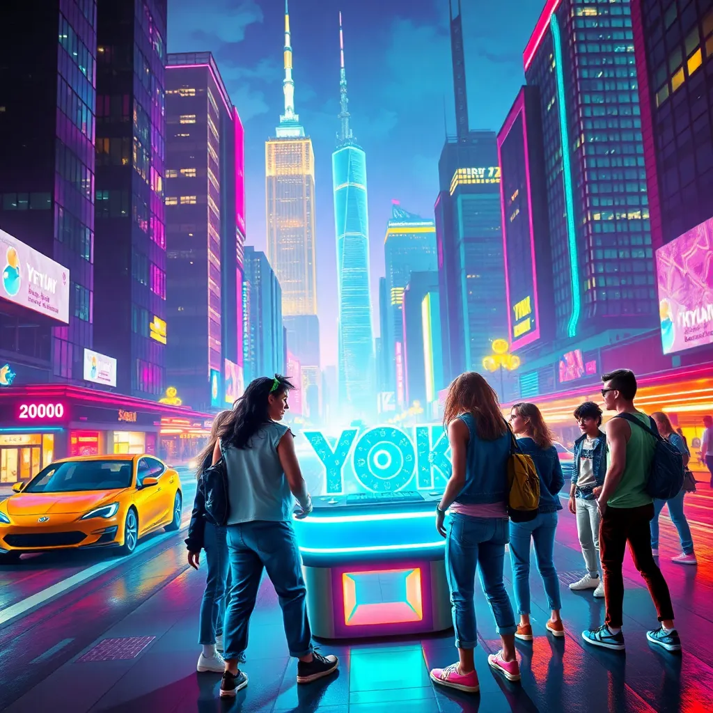Imagine a futuristic cityscape in the year 2000, with neon-lit skyscrapers and flying cars zipping by. A group of teenagers in retro outfits, think acid-washed jeans and oversized sunglasses, gather around a holographic DJ spinning a sick beat. Capture the vibrant colors and radical vibes of this Y2K party scene.