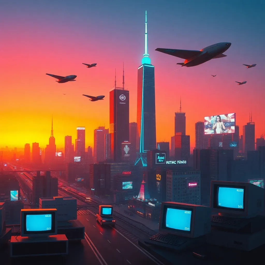 Create a futuristic cityscape at dusk, inspired by the retro-futurism of the Y2K era. Incorporate neon-lit skyscrapers, holographic advertisements, and flying cars zipping by. Add a dash of nostalgia with vintage computer monitors and pagers scattered throughout the scene, surrounded by a warm, orange-hued sunset glow.