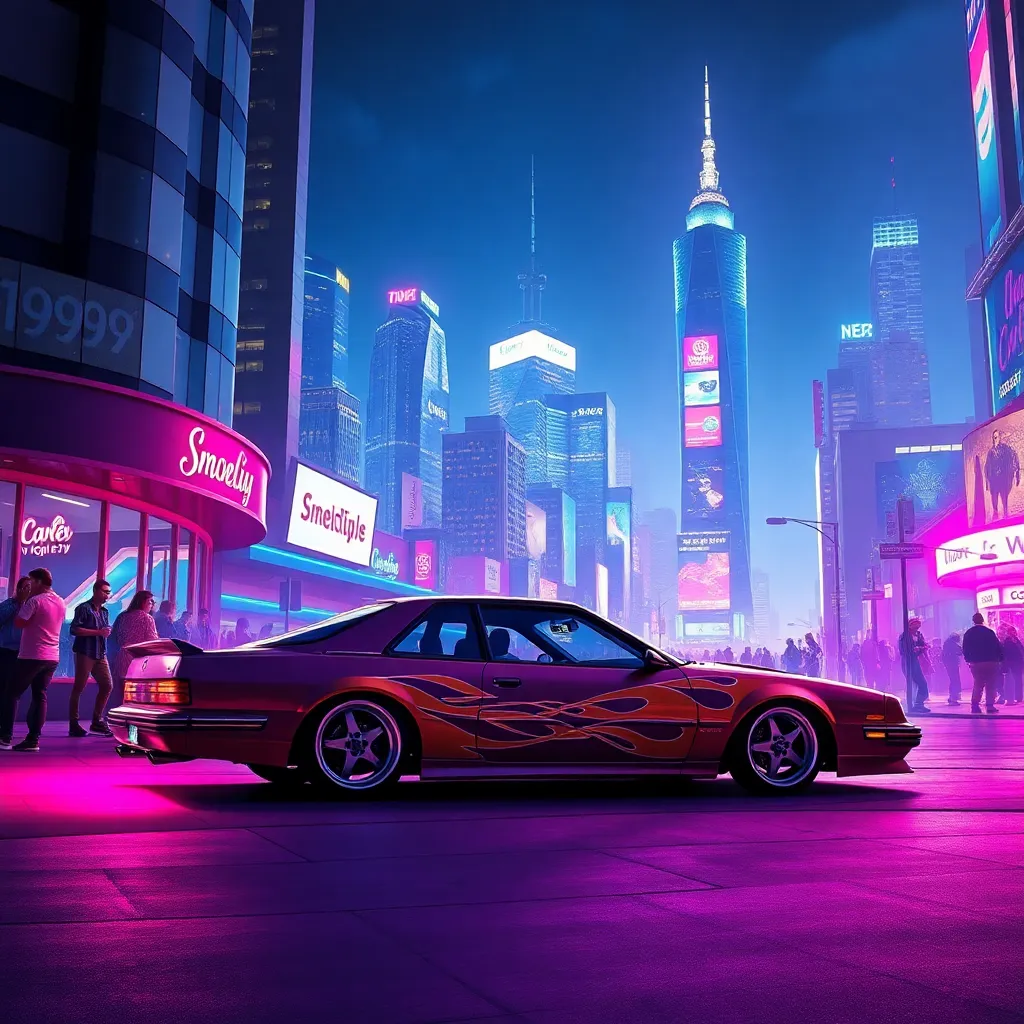 Imagine a neon-lit, futuristic cityscape in the year 1999. A sleek, low-rider car with flames painted on the side is parked outside a trendy nightclub. The city's skyline is filled with towering skyscrapers and holographic advertisements. The atmosphere is electric, with people dancing and having a blast.
