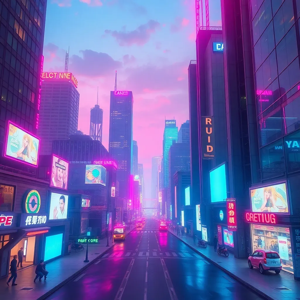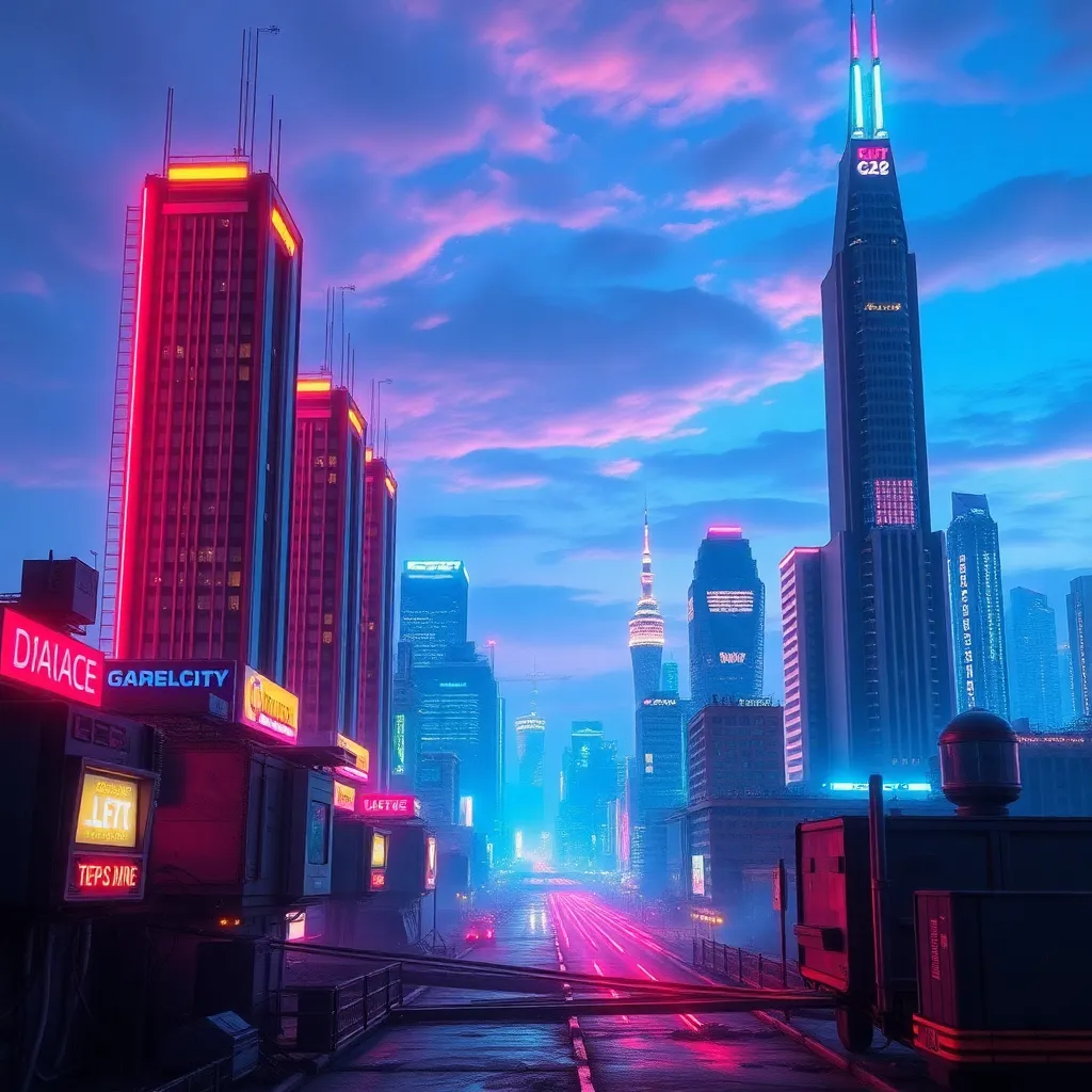 Create a futuristic cityscape at dusk, inspired by the Y2K era. Incorporate neon lights, towering skyscrapers, and retro-futuristic architecture. Add a hint of nostalgia with a old-school video game console or a flip phone. Blend vibrant colors with a sense of decay and abandonment, as if the city has been forgotten.