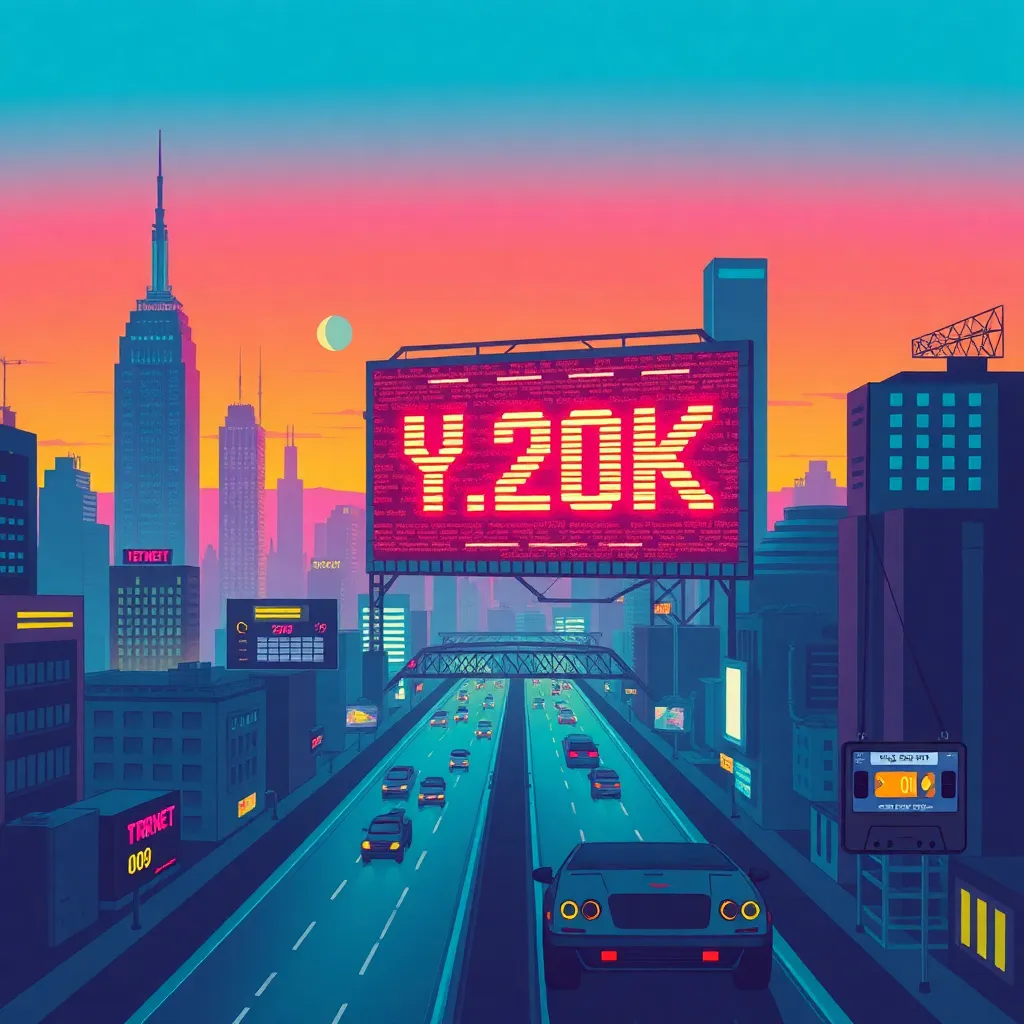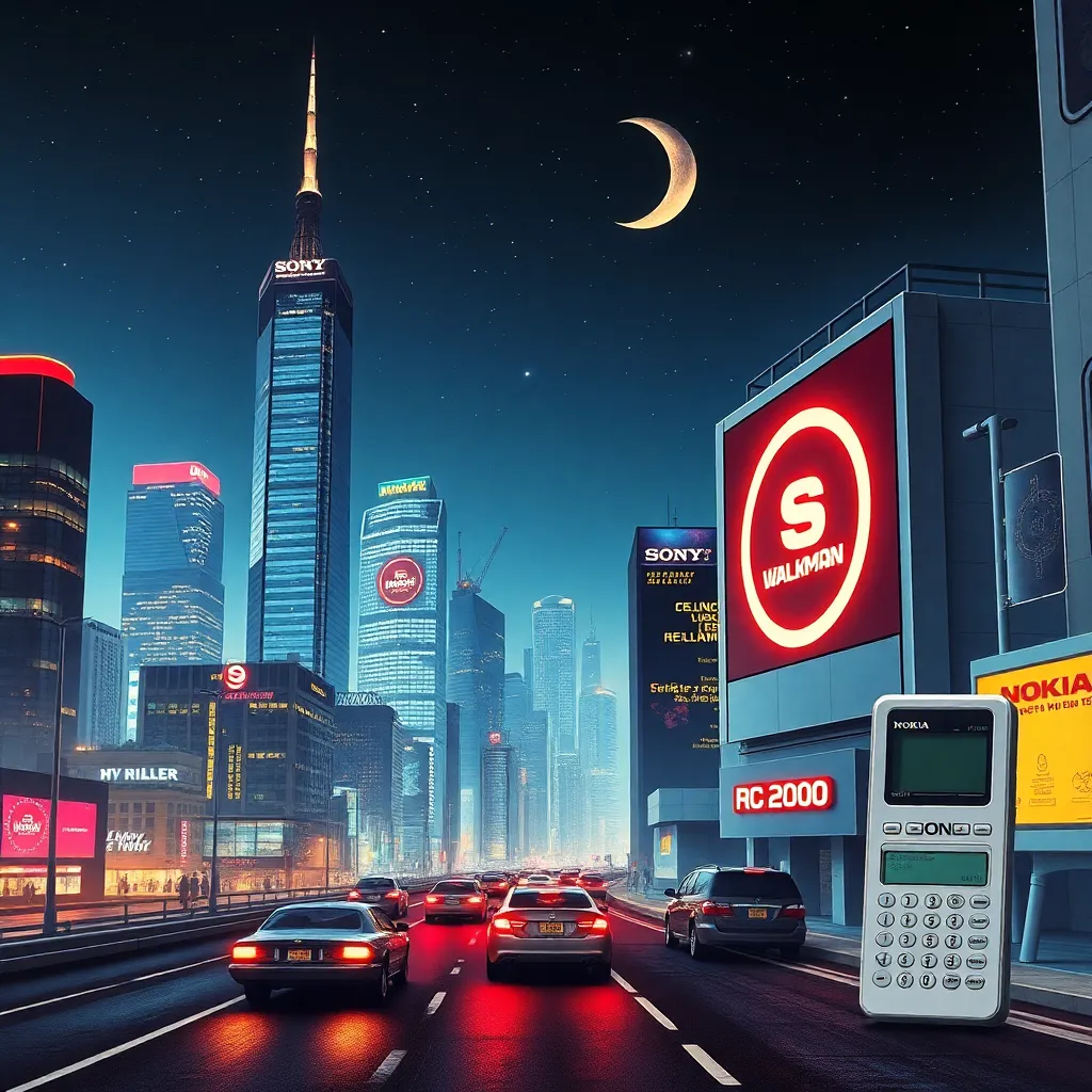 Create a futuristic cityscape at dusk, circa 1999, with neon-lit skyscrapers, hovering cars, and a giant screen displaying a glitchy internet logo. Incorporate nostalgic elements like a flip phone, a Discman, and a Cassette Tape. Use vibrant colors and bold lines to capture the essence of Y2K nostalgia.