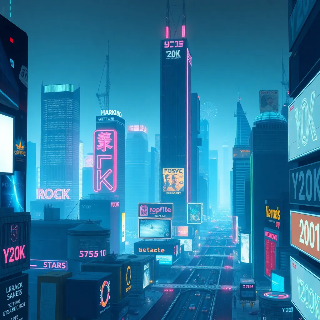 Imagine a futuristic cityscape with neon-lit skyscrapers and retro-futuristic architecture, inspired by the aesthetic of the early 2000s. Incorporate iconic Y2K elements such as flip phones, low-rise jeans, and chunky sneakers. Add a dash of cyberpunk flair with holographic advertisements and glowing streetlights. Generate an image that captures the essence of this nostalgic yet futuristic world.