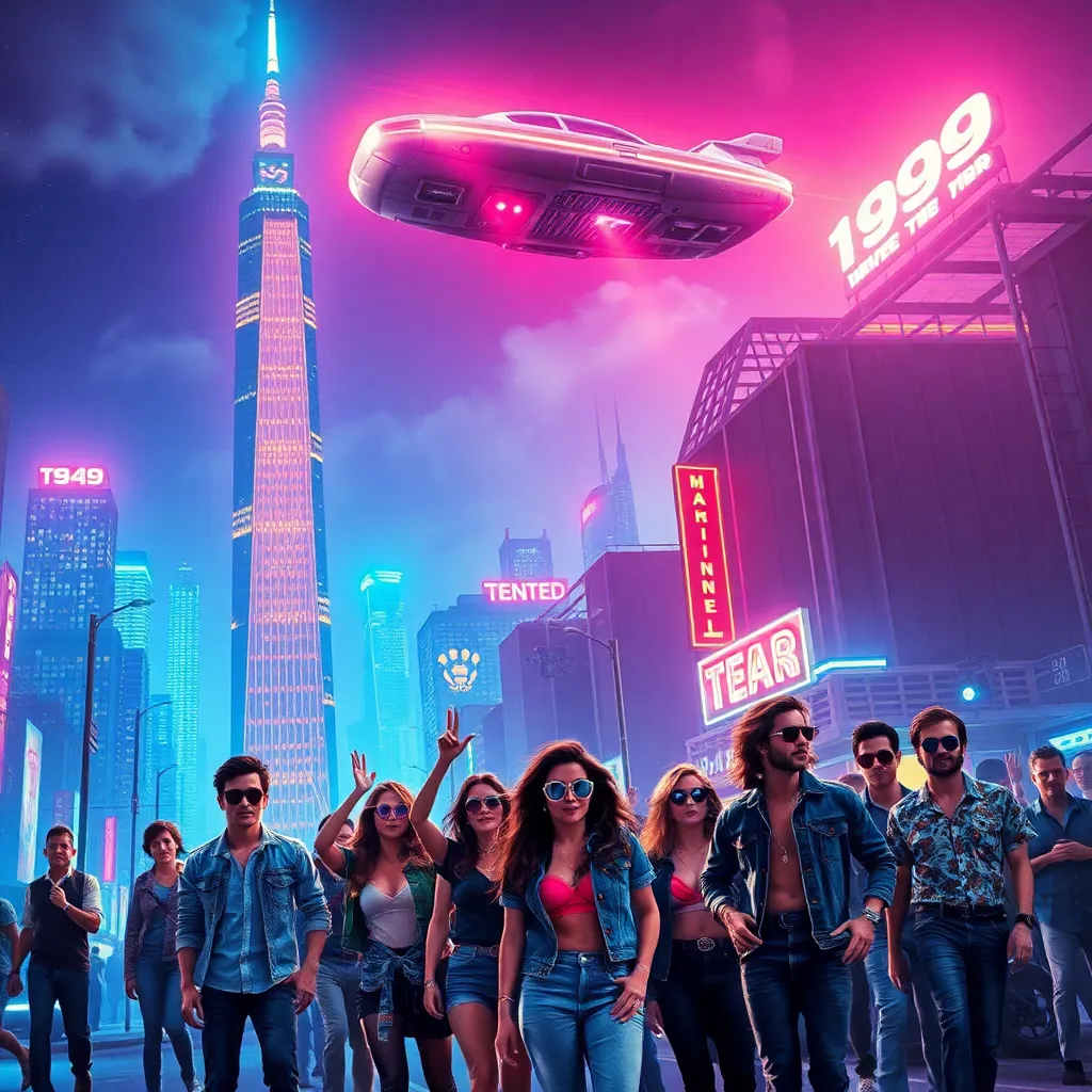 Create a futuristic yet nostalgic scene set in the year 1999, featuring a neon-lit cityscape with a retro-futuristic skyscraper, a flying car hovering above, and a group of people in acid-washed jeans and oversized sunglasses celebrating the dawn of a new millennium with a massive party in the streets.