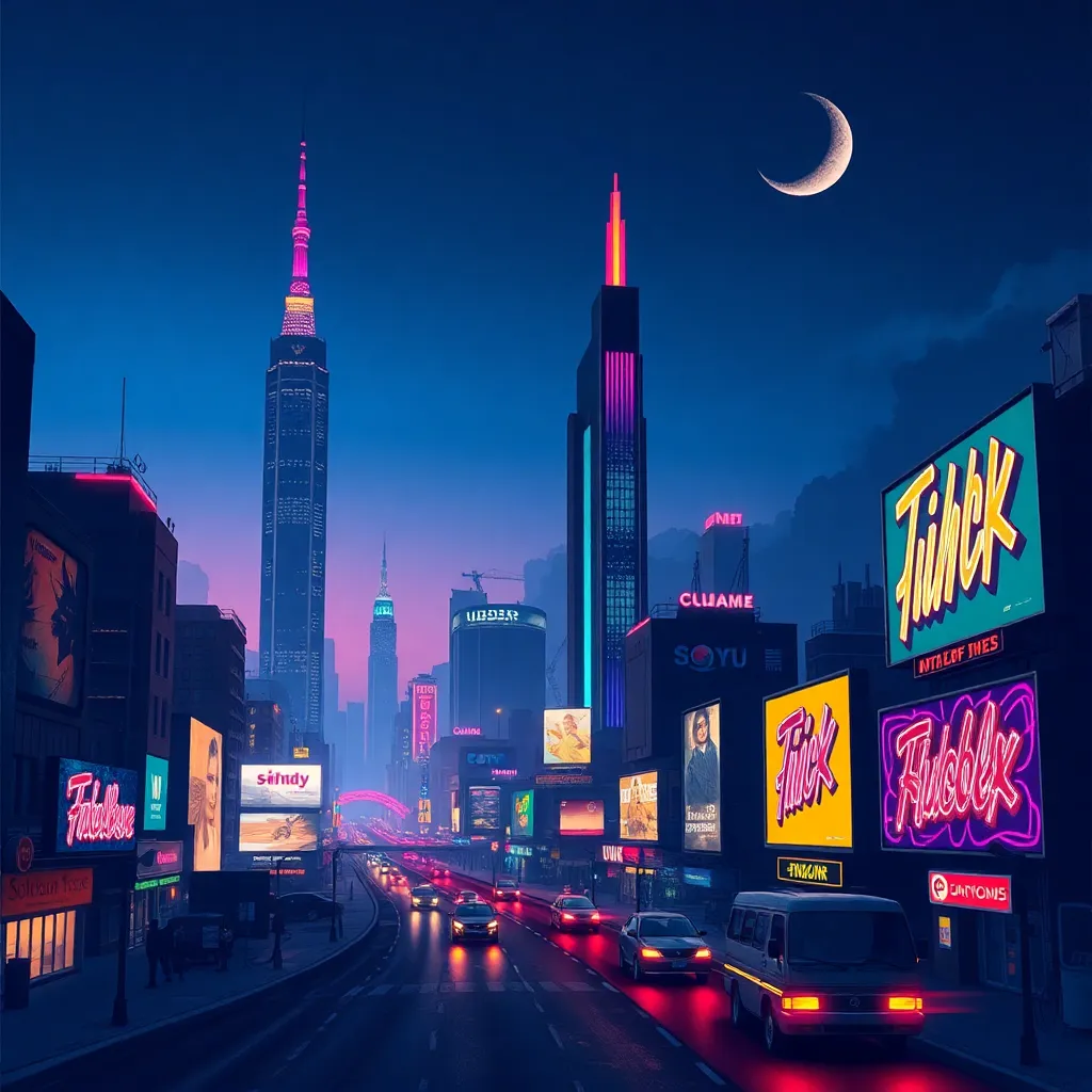 Create a futuristic cityscape at dusk, with neon-lit skyscrapers and retro-futuristic architecture inspired by the Y2K era. Incorporate flying cars, hoverboards, and retro-style billboards with bold, graffiti-like typography. The sky should be a deep shade of indigo, with a crescent moon and a hint of smog