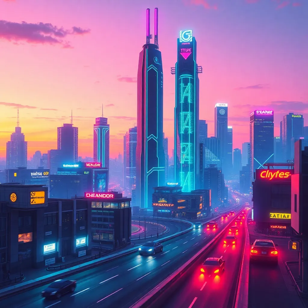 Create a futuristic cityscape at dusk, blending retrofuturistic and cyberpunk elements. Incorporate neon-lit skyscrapers, hovercars, and a sprawling metropolis with a hint of nostalgia. Imagine a world where technology and nostalgia collide, set against a warm orange and purple sunset. Give it a retro Y2K vibe!