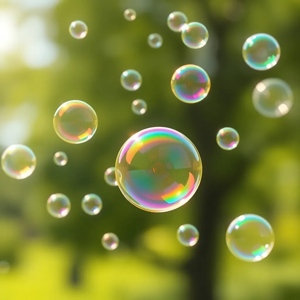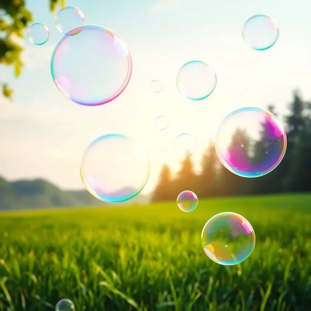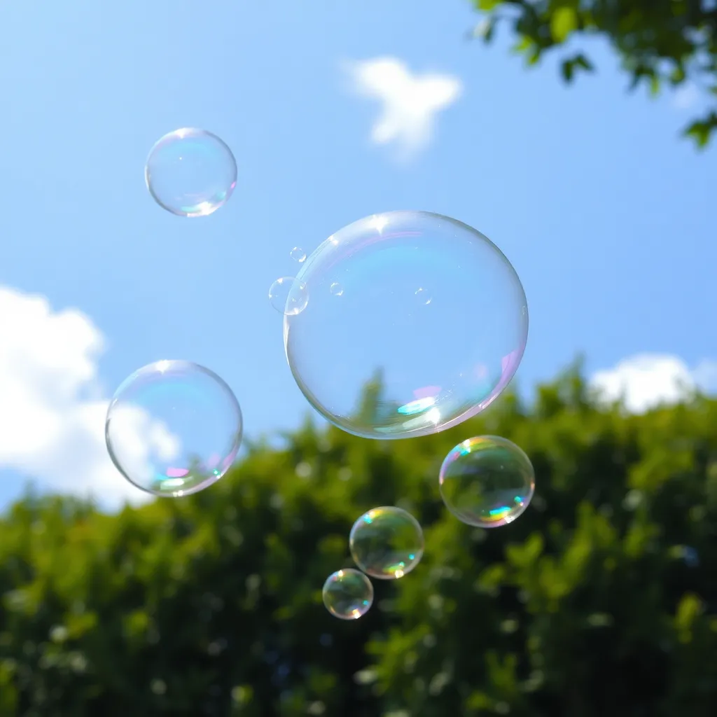 Capture the whimsy of a sunny day with a burst of colorful soap bubbles floating gently in the air, their delicate forms refracting the light and creating a mesmerizing display of shimmering colors. Incorporate a subtle background of lush greenery and a few wispy clouds to complete the serene scene.