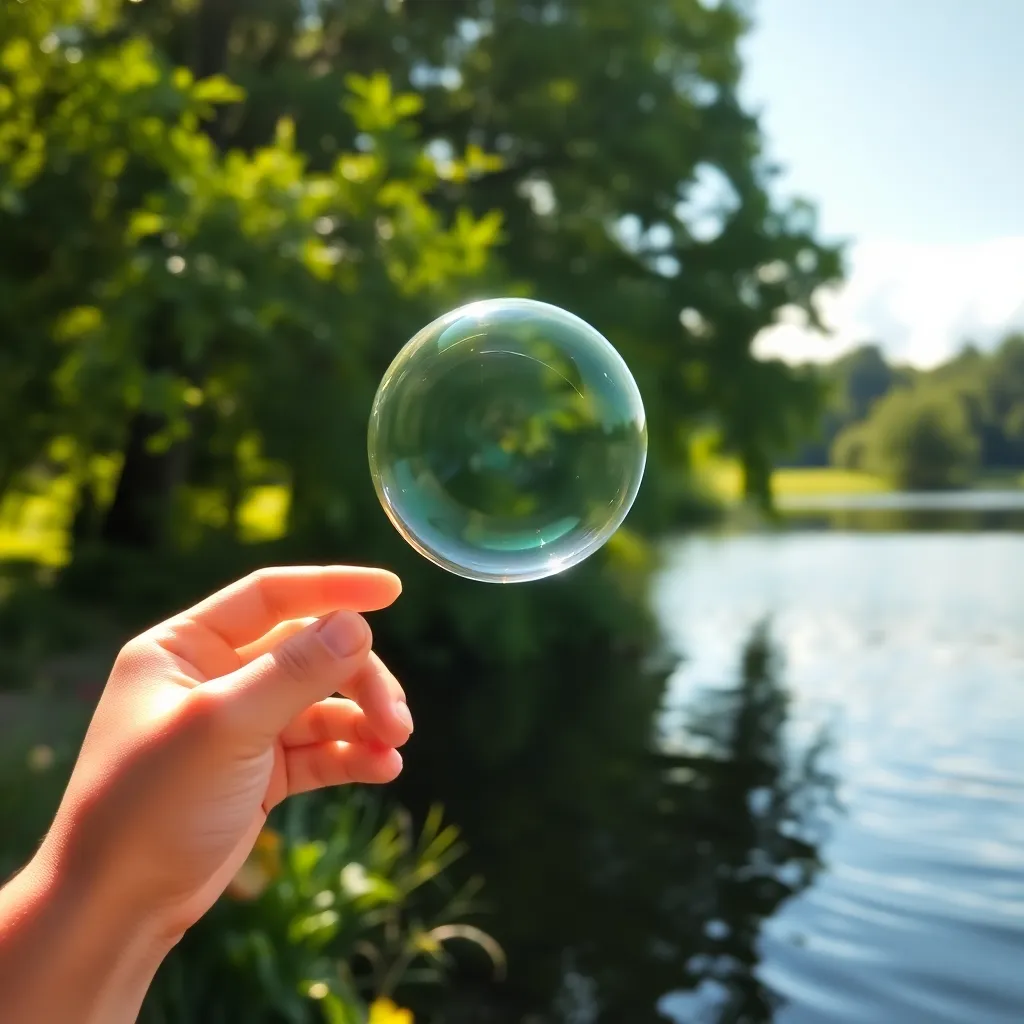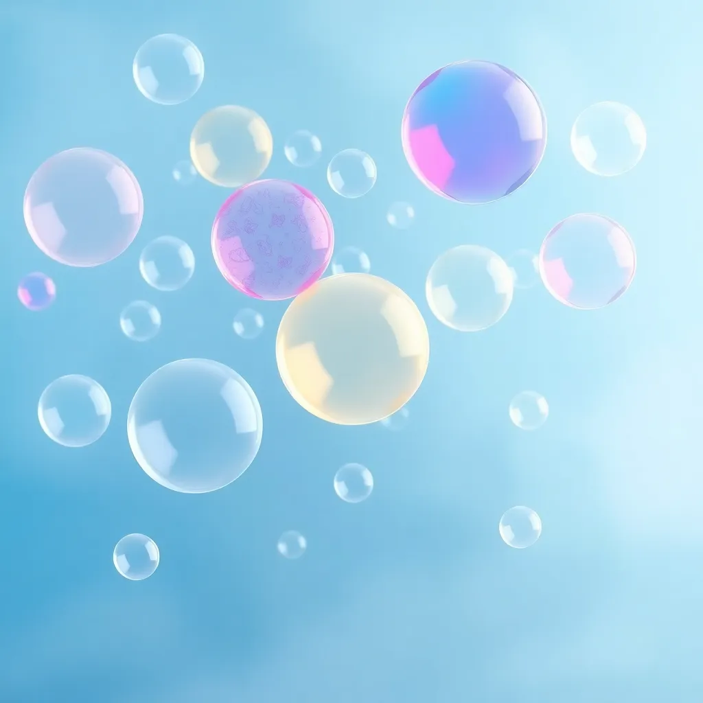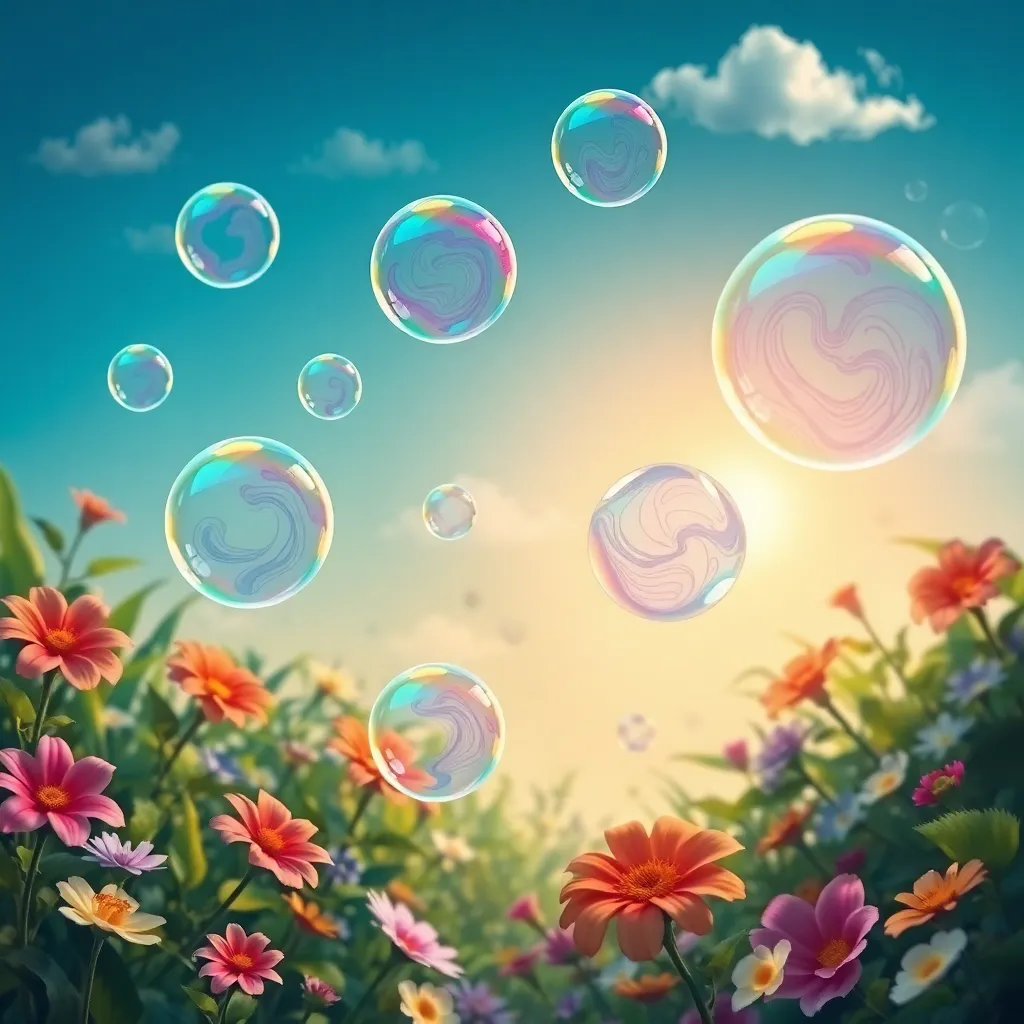 Capture the whimsy of a sunny day with a burst of colorful soap bubbles floating gently in the air, their delicate forms refracting the light and creating a mesmerizing display of shimmering colors. Incorporate a subtle background of lush greenery and a few wispy clouds to complete the serene scene.