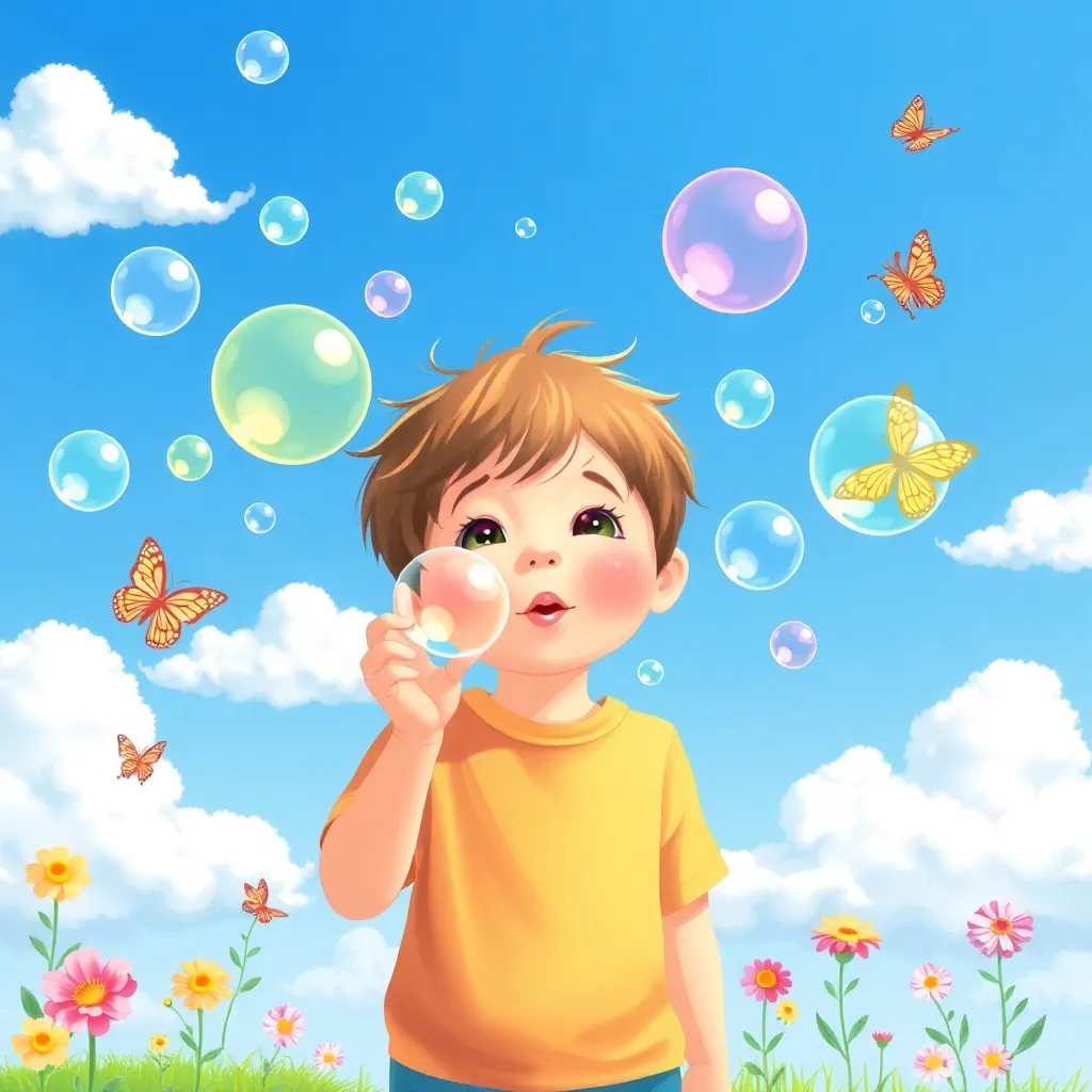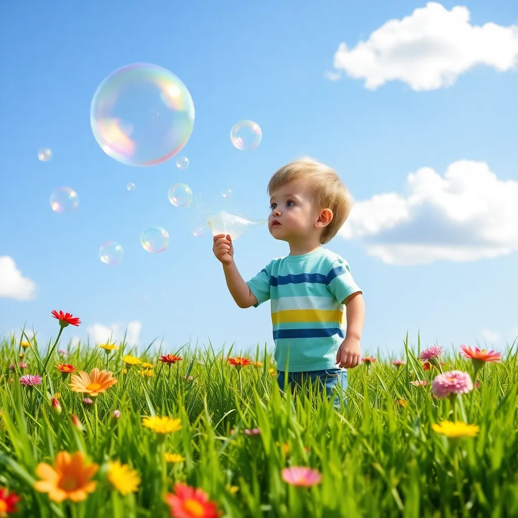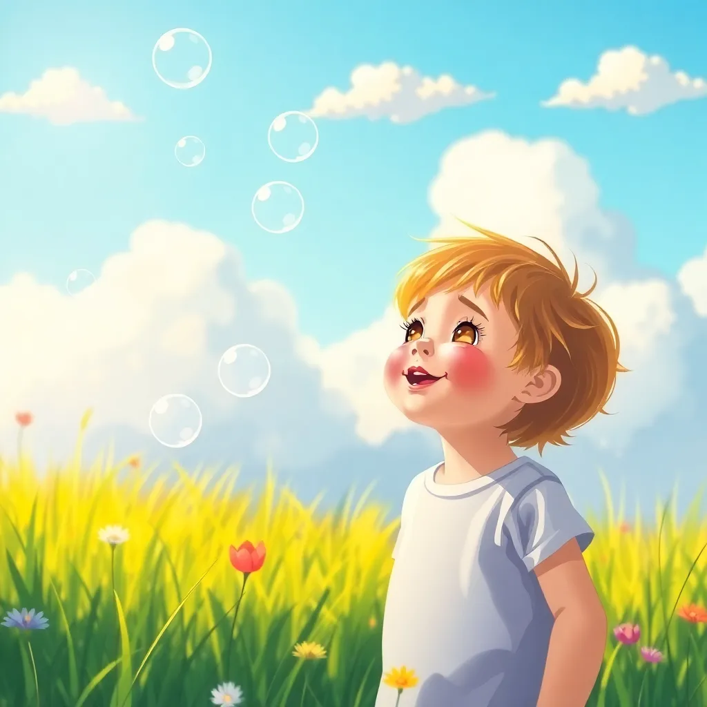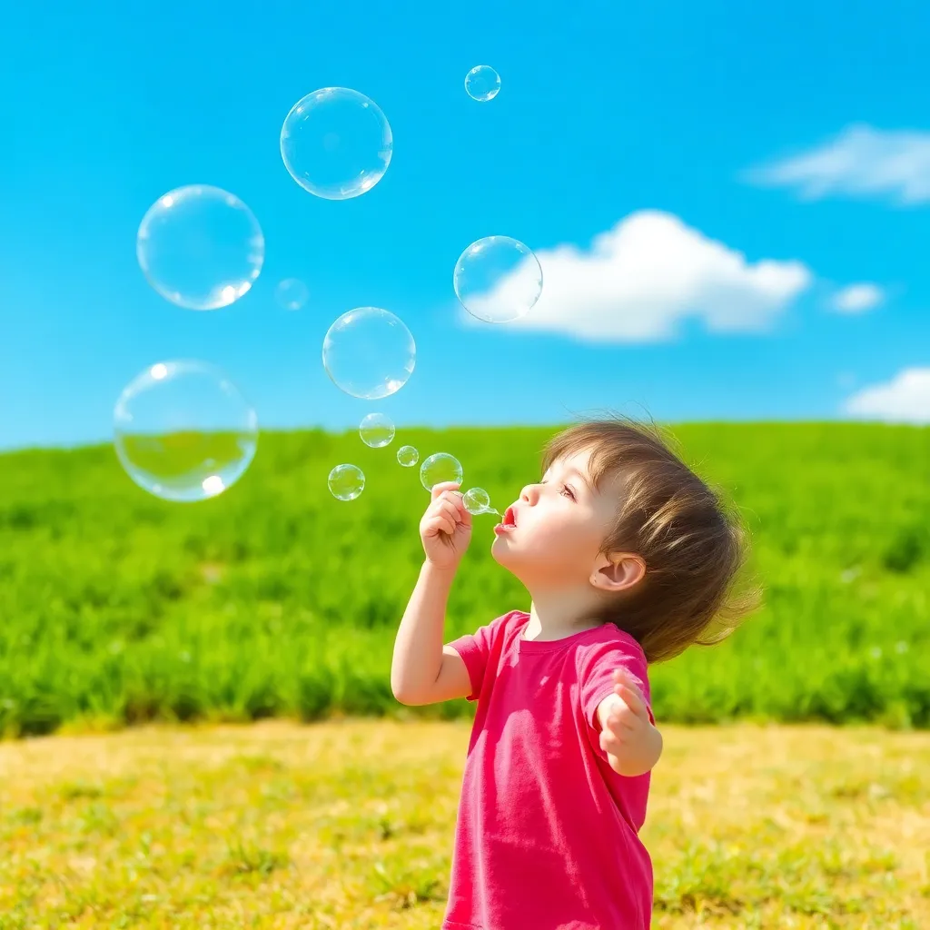 Create a whimsical scene featuring a child blowing soap bubbles in a sunny meadow, surrounded by vibrant flowers and a few wispy clouds. Incorporate a sense of movement and playfulness, with bubbles of varying sizes and shapes floating gently through the air, capturing the carefree joy of childhood.