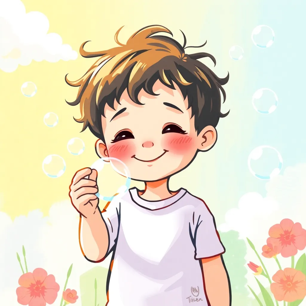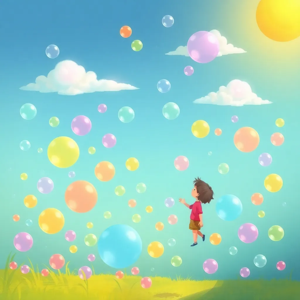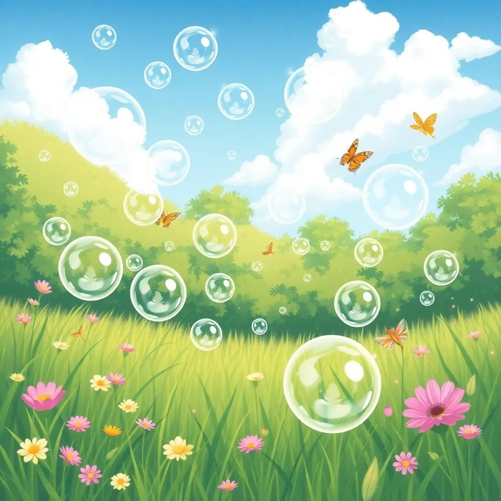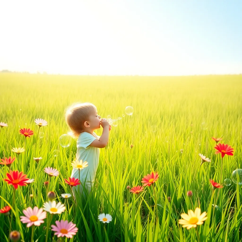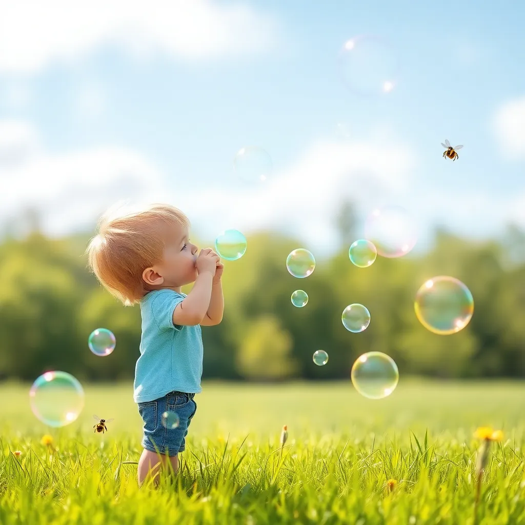 Create a whimsical scene featuring a child blowing soap bubbles in a sunny meadow, surrounded by vibrant flowers and a few wispy clouds. Incorporate a sense of movement and playfulness, with bubbles of varying sizes and shapes floating gently through the air, capturing the carefree joy of childhood.