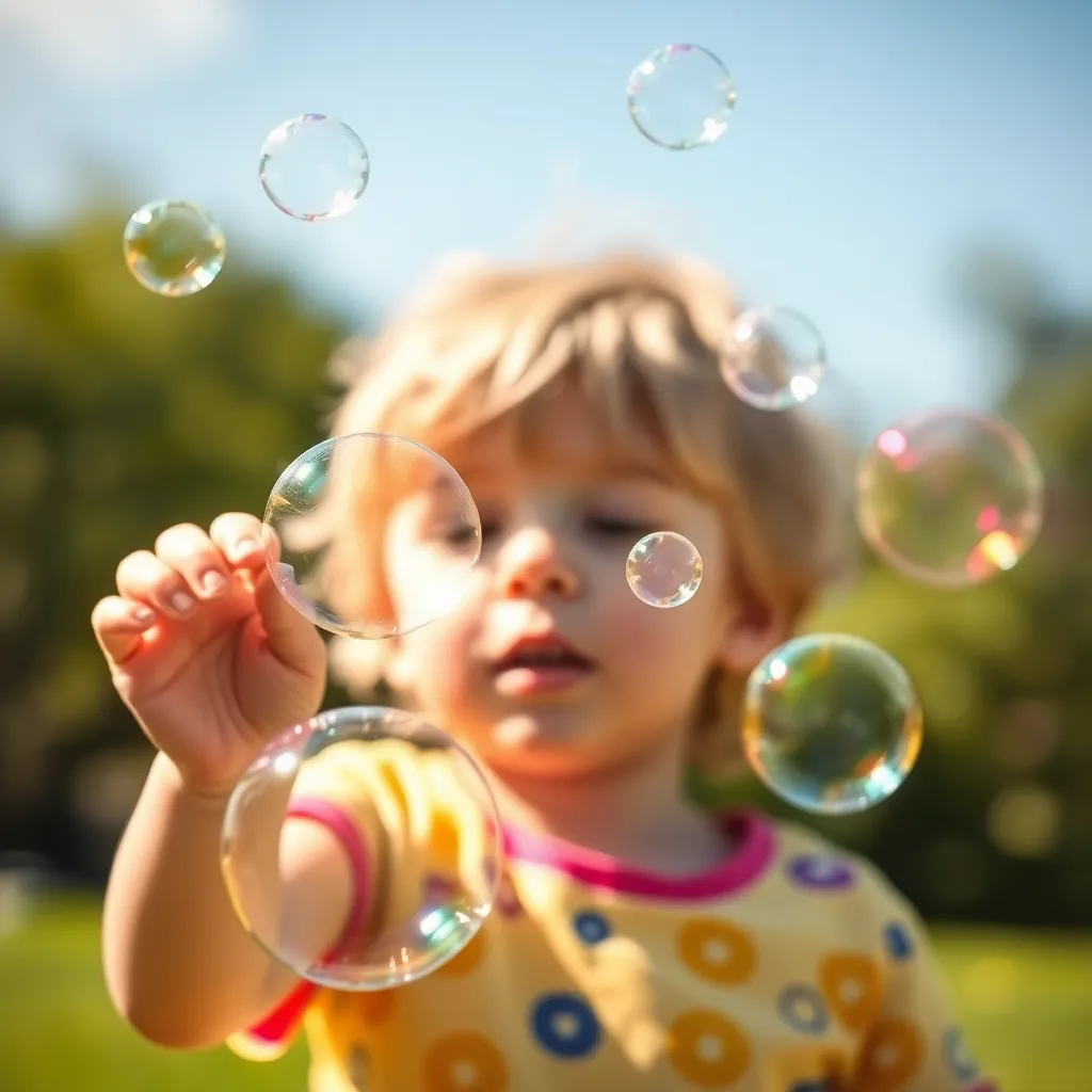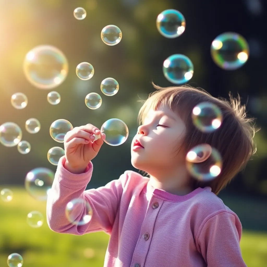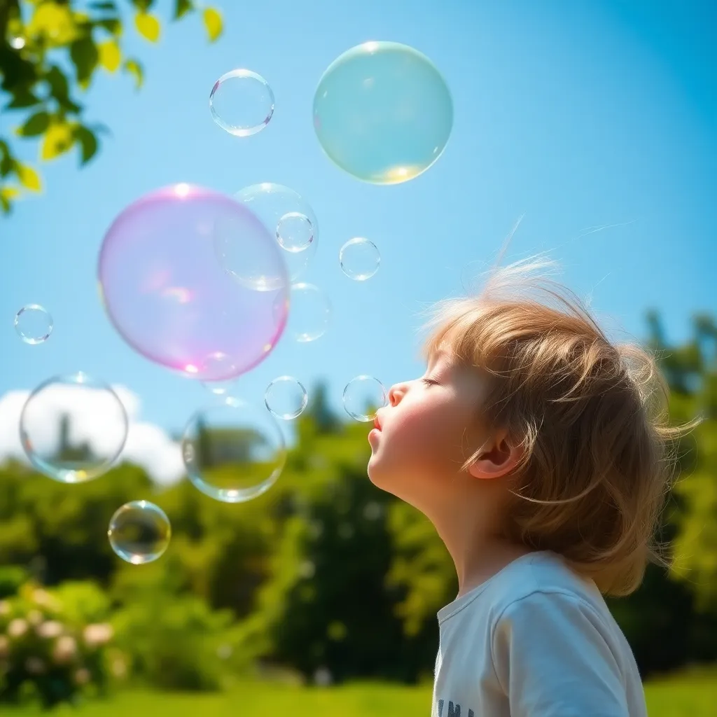 Create a whimsical scene of a child blowing soap bubbles on a sunny day. Incorporate vibrant colors, soft focus, and delicate details. The bubbles should be varying sizes, with some popping and others lingering in mid-air. Incorporate subtle textures and a sense of movement to capture the joy and wonder.