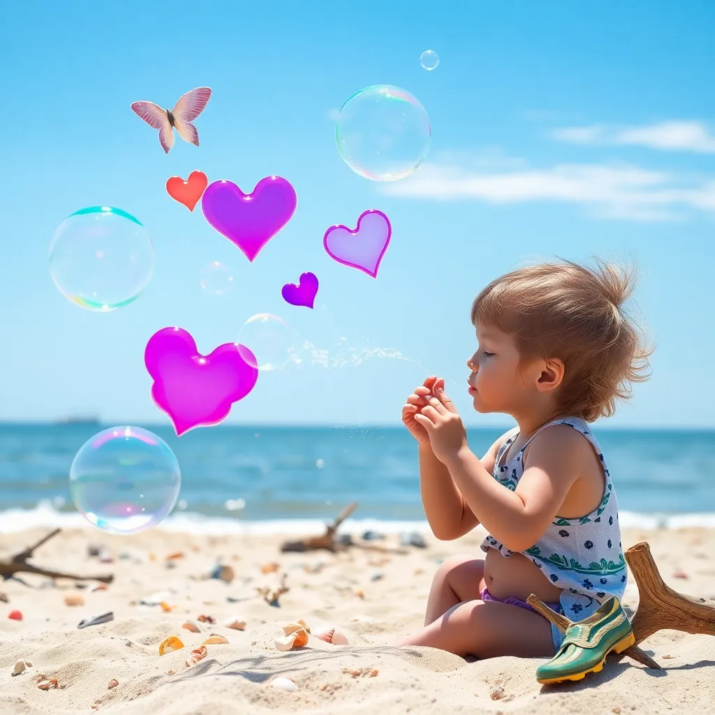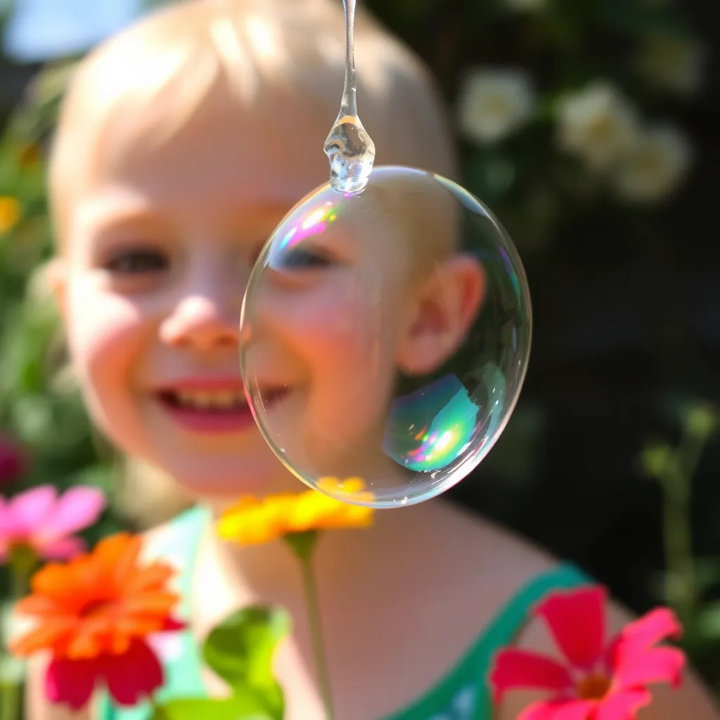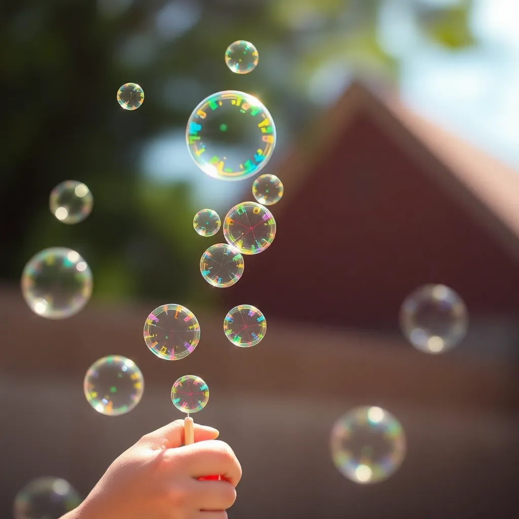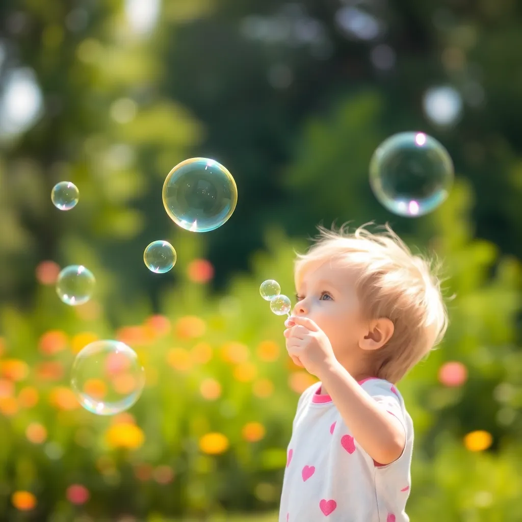 Create a whimsical scene of a child blowing soap bubbles on a sunny day. Incorporate vibrant colors, soft focus, and delicate details. The bubbles should be varying sizes, with some popping and others lingering in mid-air. Incorporate subtle textures and a sense of movement to capture the joy and wonder.