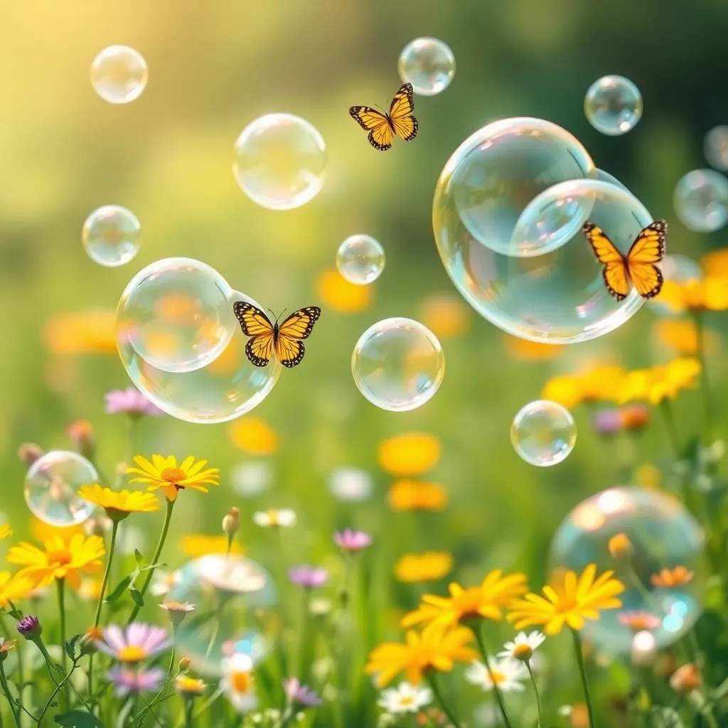Create an whimsical scene of soap bubbles floating gently through a sunny meadow, with vibrant wildflowers and a few curious butterflies fluttering about. Incorporate a sense of movement and texture, with bubbles of varying sizes and shapes, and a soft, dreamy background to evoke a sense of wonder and joy.
