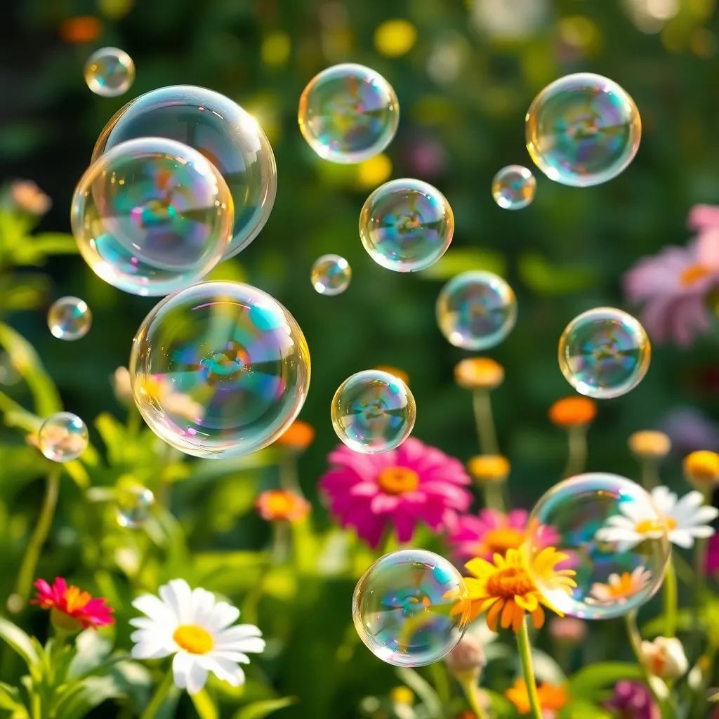 Create a whimsical scene of soap bubbles floating in the air, surrounded by lush greenery and vibrant flowers. The bubbles are iridescent and shimmering, reflecting the warm sunlight. Incorporate subtle hints of movement, as if the bubbles are about to pop, adding a sense of playfulness and wonder to the image.
