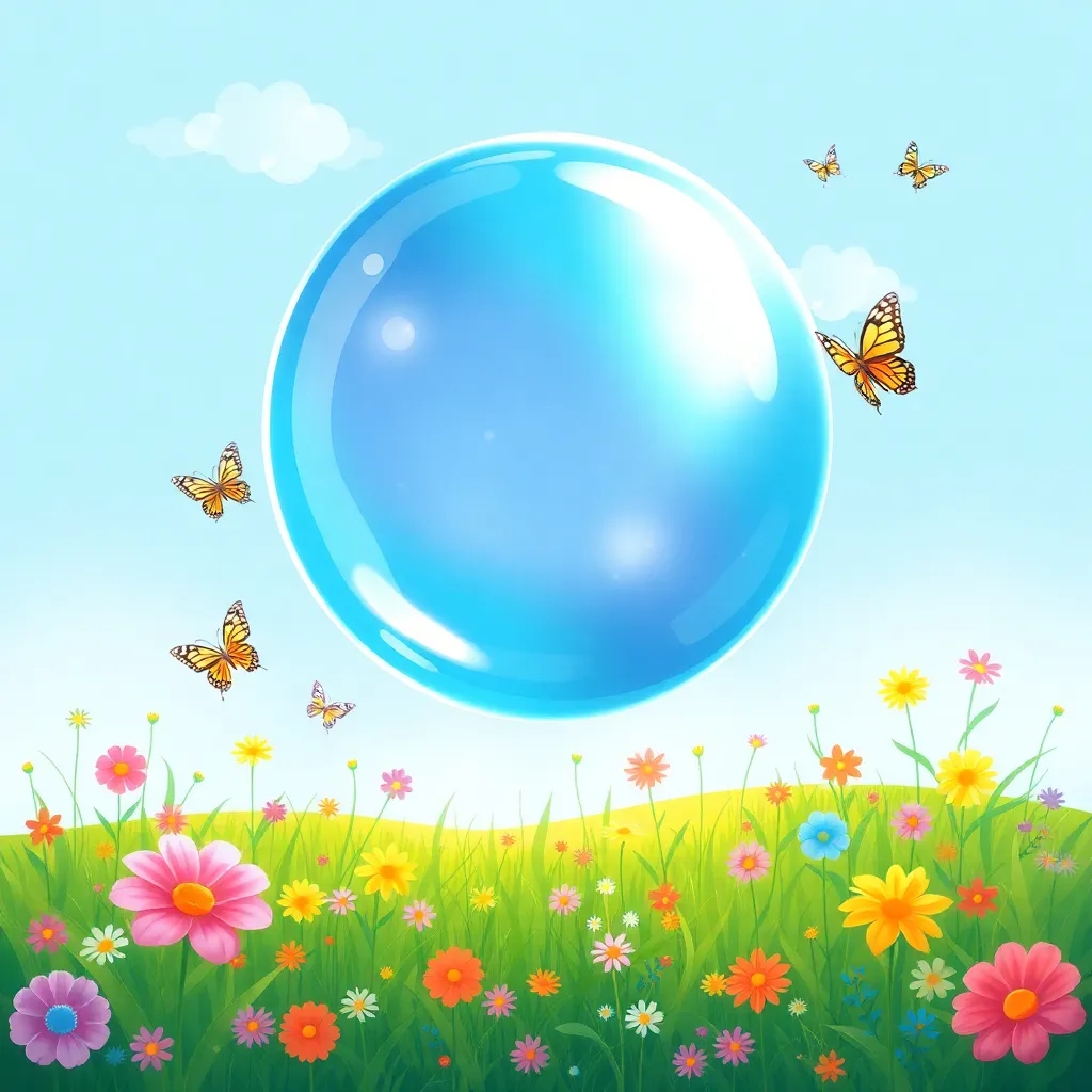 Create a whimsical illustration of a child's imagination come to life. A bright blue soap bubble floats above a lush green meadow, filled with fluttering butterflies, colorful flowers, and a few wispy clouds. The bubble's surface ripples with a soft, shimmering light, as if it's about to burst with magic.