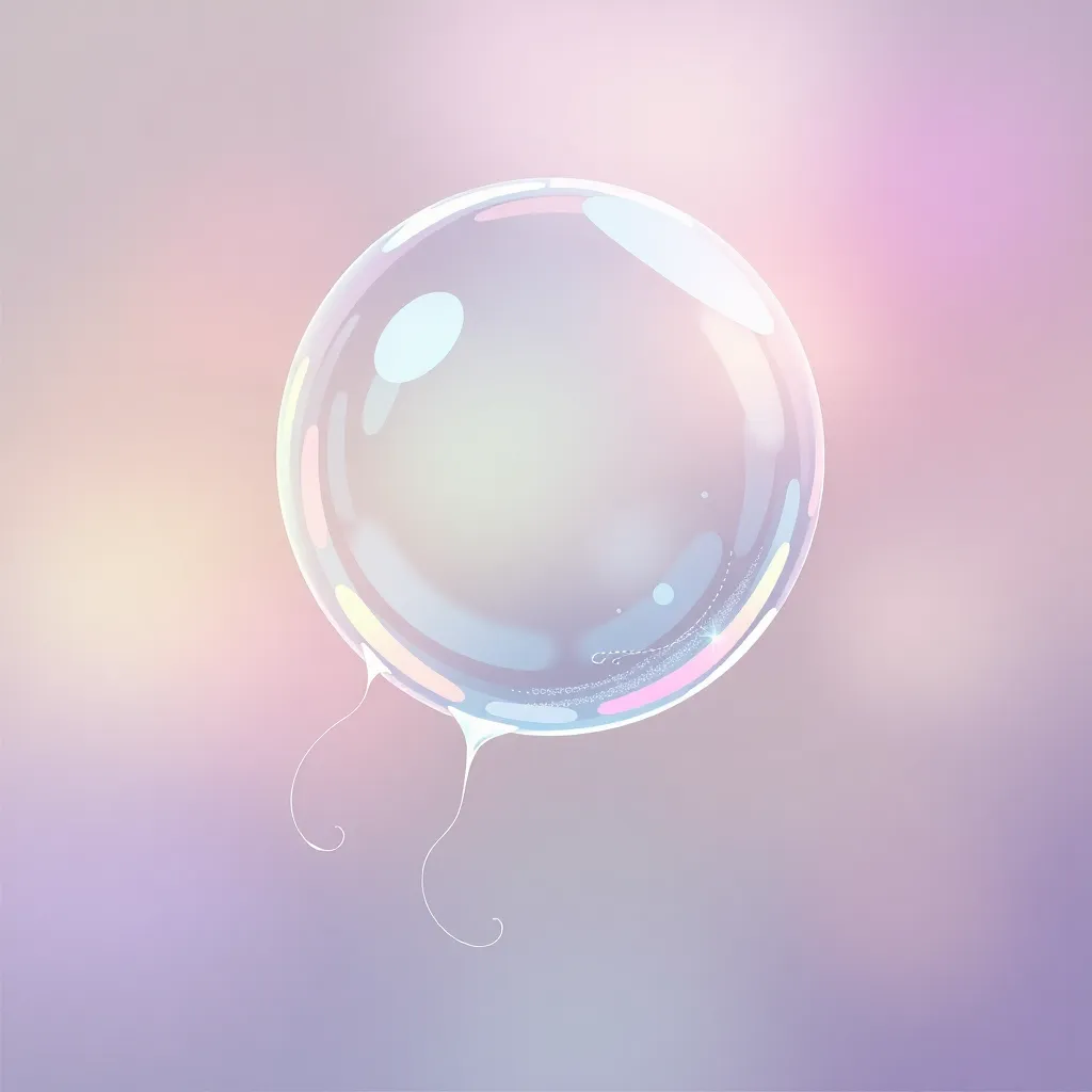 Create a whimsical illustration of a soap bubble floating in mid-air, surrounded by a subtle mist of iridescent colors. The bubble should have a delicate, lacy pattern and a few wispy tendrils extending from it. Incorporate a few strategically placed highlights to give the image a sense of depth and dimension.