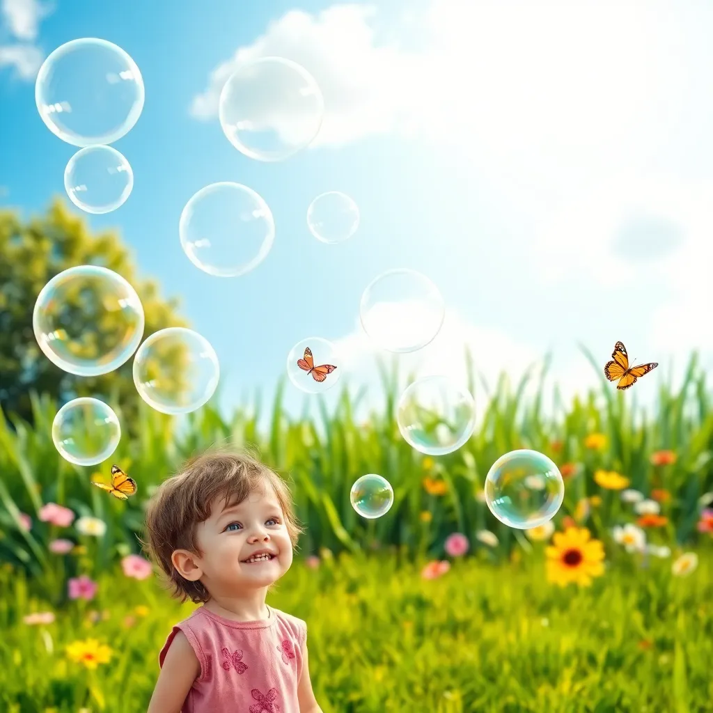 Create an enchanting scene of a child blowing soap bubbles on a sunny day. The bubbles should be various sizes and shapes, floating gently in the air amidst a backdrop of lush green grass, colorful flowers, and a bright blue sky with a few puffy white clouds. Add a few butterflies and a smiling child in the foreground.