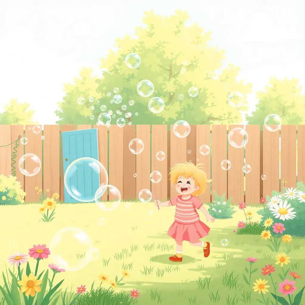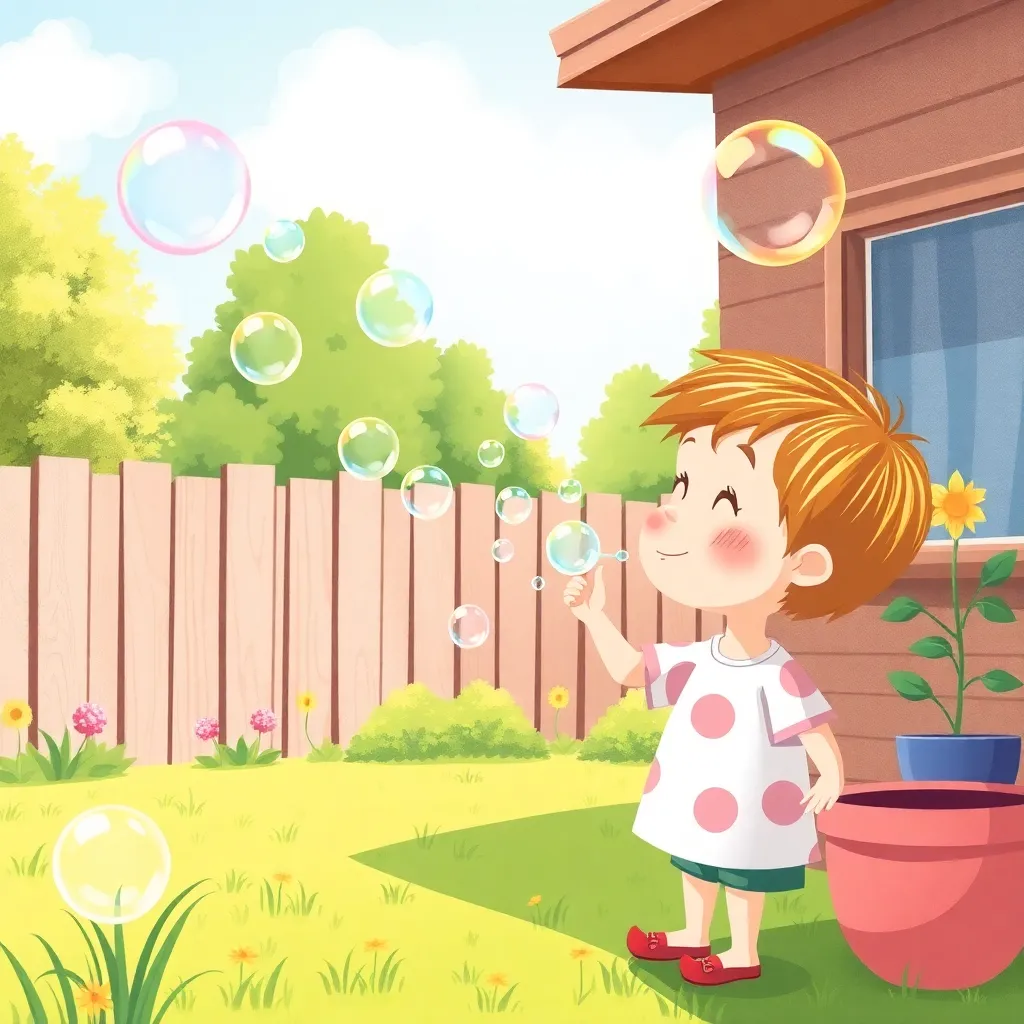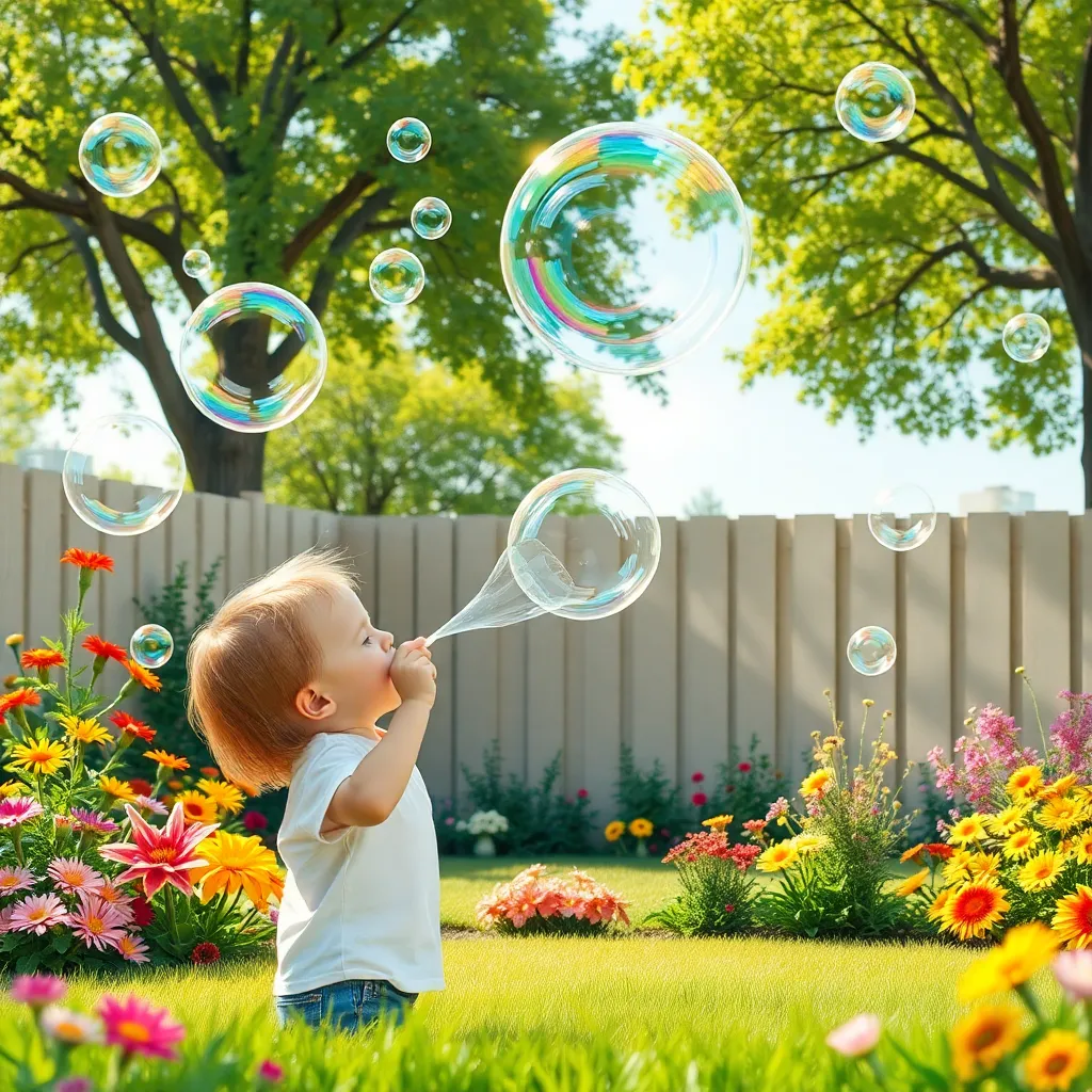 Create a whimsical scene of a child blowing soap bubbles on a sunny day, surrounded by lush greenery and vibrant flowers. The bubbles should be various shapes and sizes, with some popping and others floating away, capturing the carefree joy of childhood. Use pastel colors and soft focus for a dreamy effect.