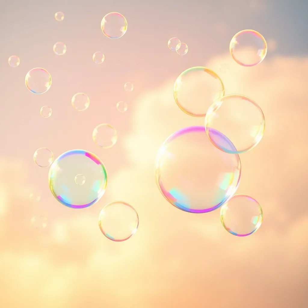 Imagine a whimsical summer afternoon, where soap bubbles of various shapes and sizes float gently through the air, catching the warm sunlight and reflecting vibrant colors. Create an AI image that captures the magic of this scene, with bubbles of every hue and texture, suspended in a soft, cloudy background.