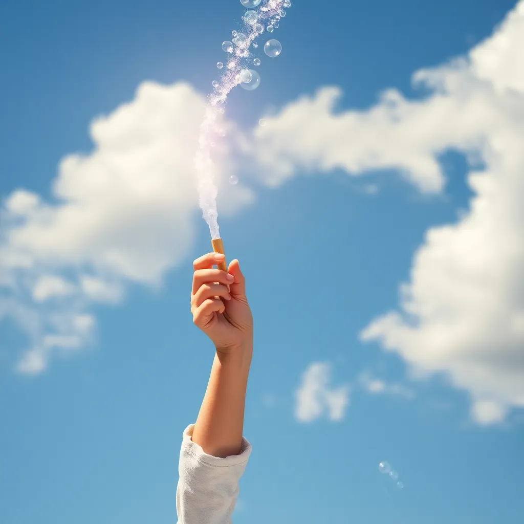Create an whimsical scene of a child blowing soap bubbles on a sunny day. Incorporate vibrant colors, fluffy clouds, and a serene background. The bubbles should be varied in size and shape, with some popping and others floating away. Capture the magic and wonder of childhood in this AI-generated image.