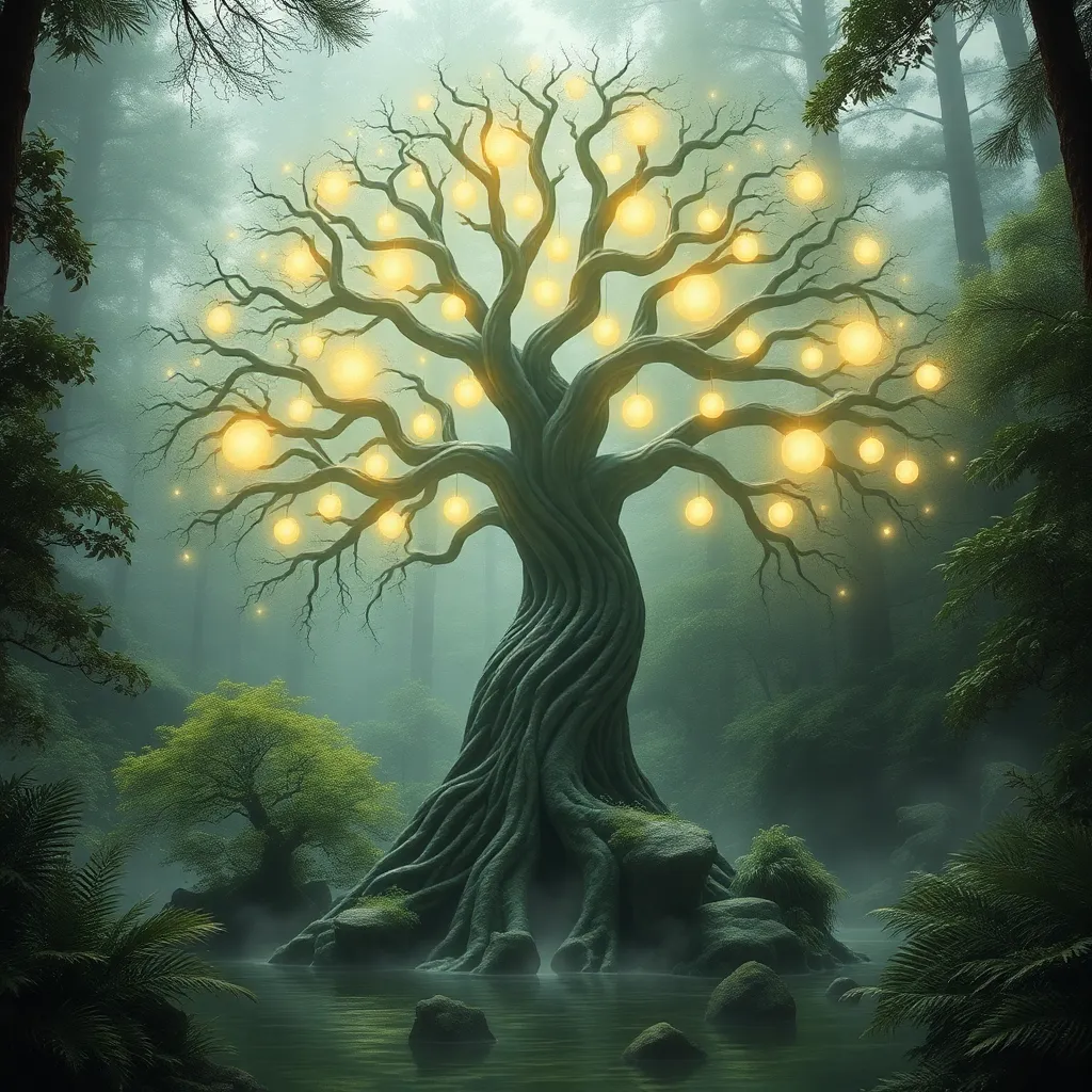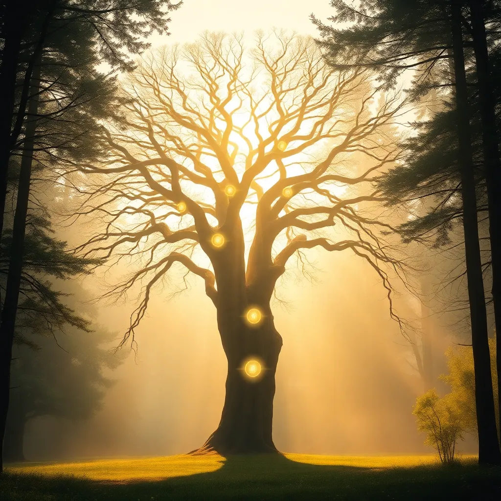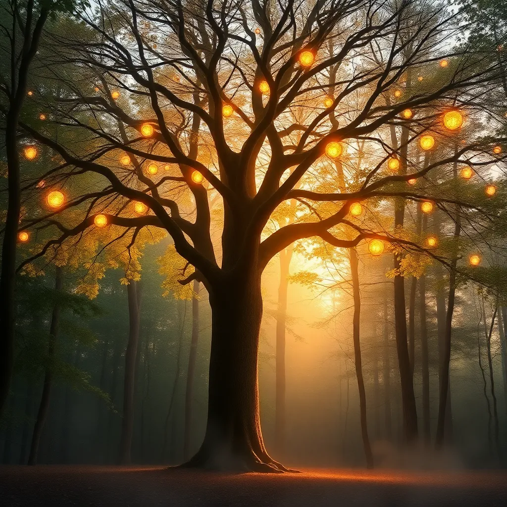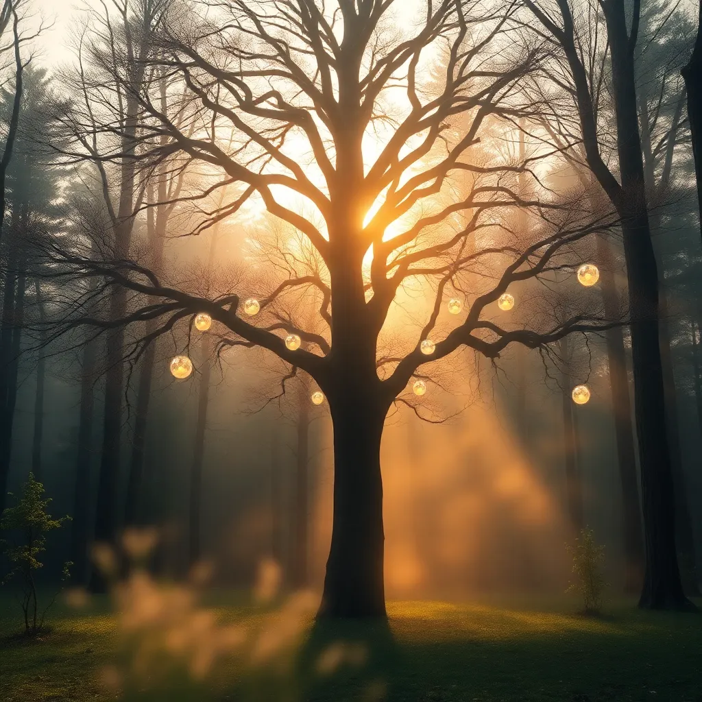 Imagine a serene, mystical forest glade at dawn, bathed in soft, golden light. A wispy fog rises from the earth, carrying the whispers of ancient wisdom. In the center, a majestic tree stands tall, its branches adorned with glowing, ethereal orbs. The air is filled with the sweet scent of blooming flowers.