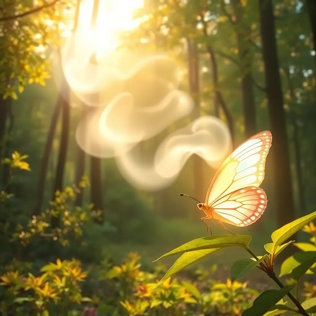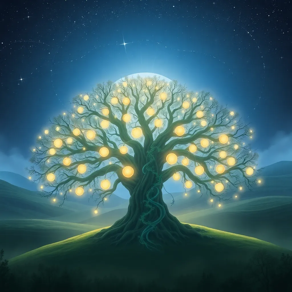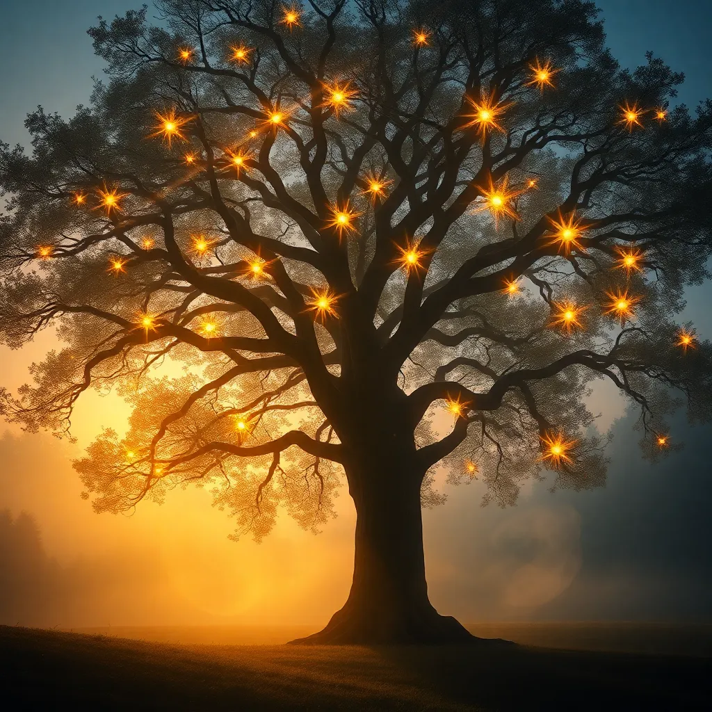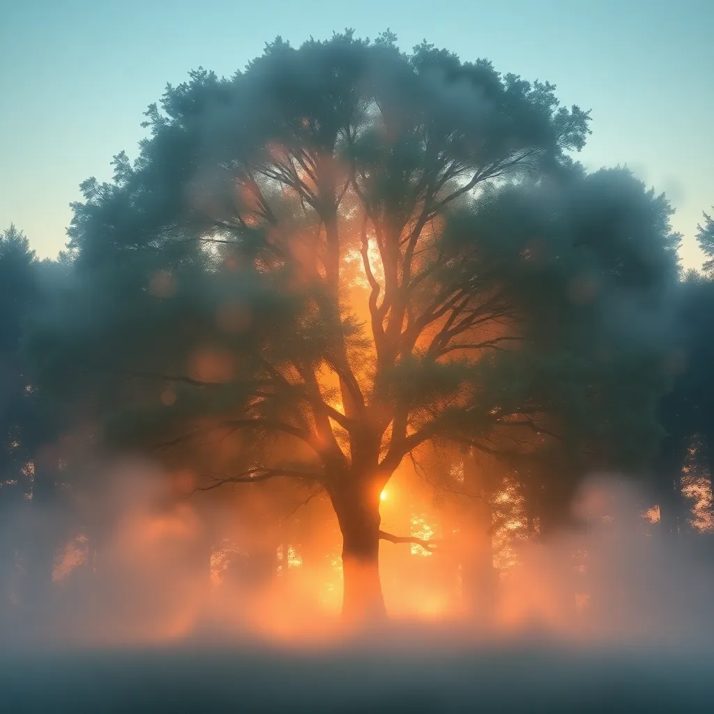 Imagine a serene, mystical forest glade at dawn, bathed in soft, golden light. A wispy fog rises from the earth, carrying the whispers of ancient wisdom. In the center, a majestic tree stands tall, its branches adorned with glowing, ethereal orbs. The air is filled with the sweet scent of blooming flowers.