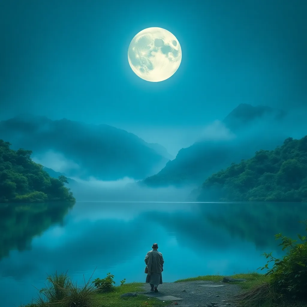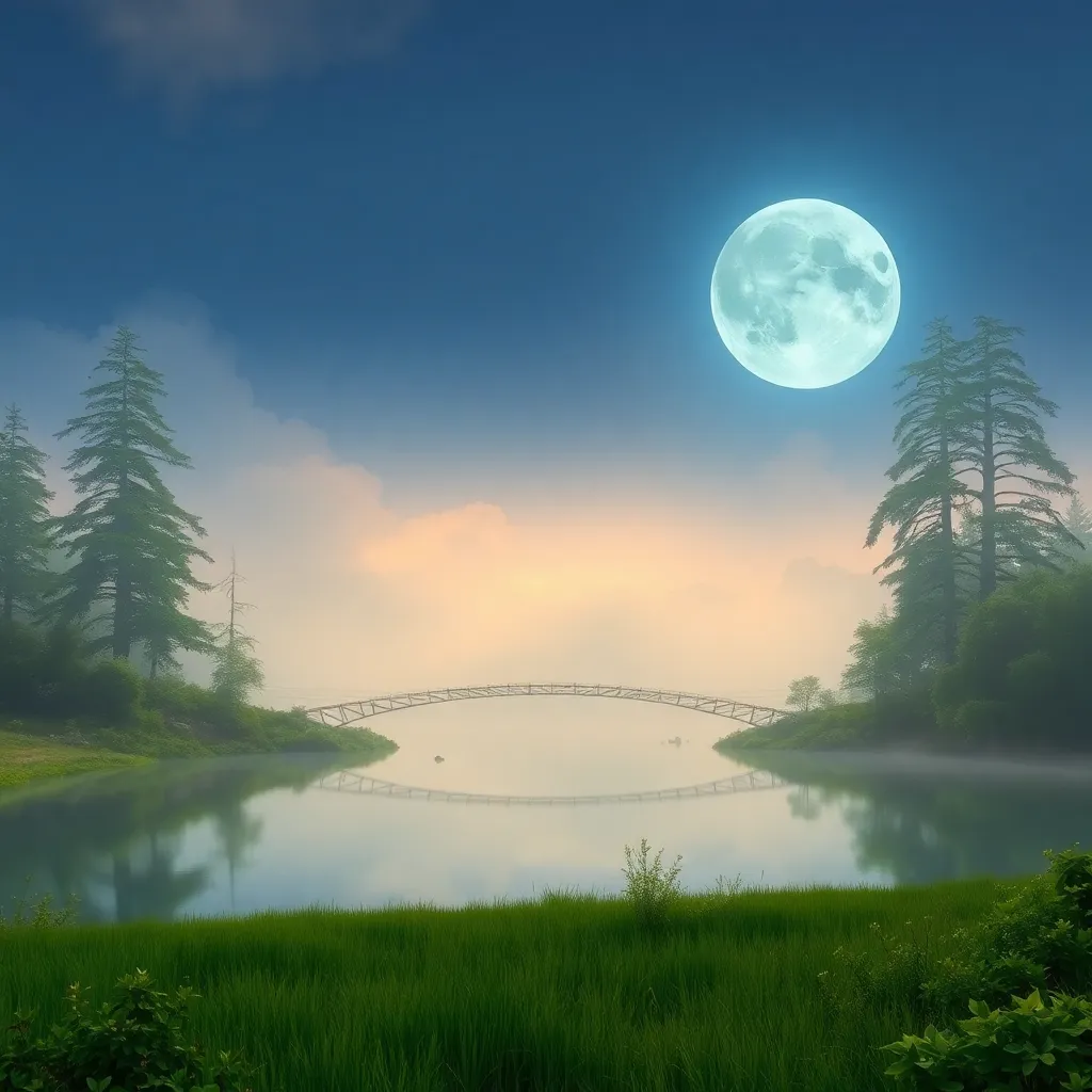 Create an ethereal landscape with a serene lake in the center, surrounded by lush greenery and towering trees. In the sky, a full moon glows with an aura of soft blue light. A delicate, filigree-like bridge stretches across the lake, connecting two misty islands. The atmosphere is peaceful and mystical.
