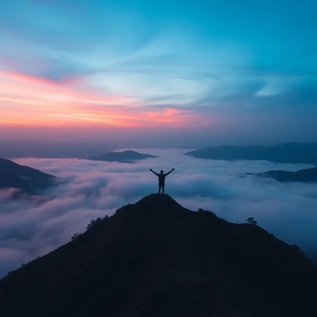 Envision a serene landscape at dusk, where a gentle mist rises from the mountainside, carrying the whispers of ancient wisdom. A lone figure stands atop the peak, arms outstretched, as the sky transforms into a kaleidoscope of colors, symbolizing the connection between the physical and spiritual realms.