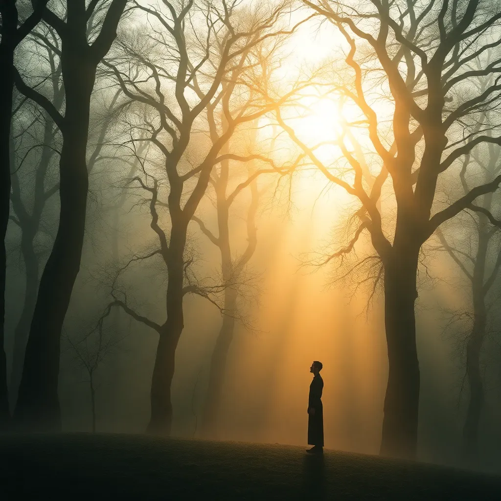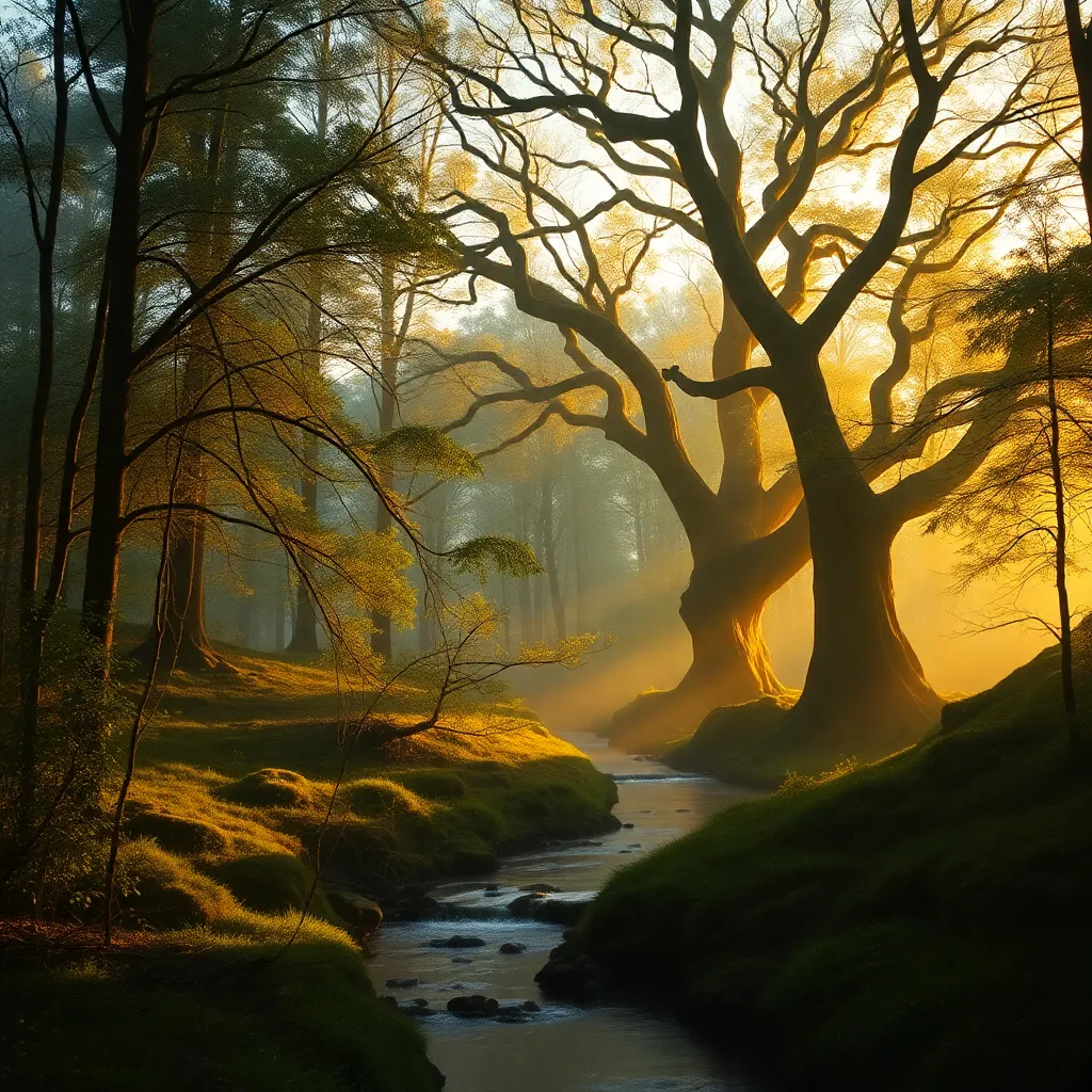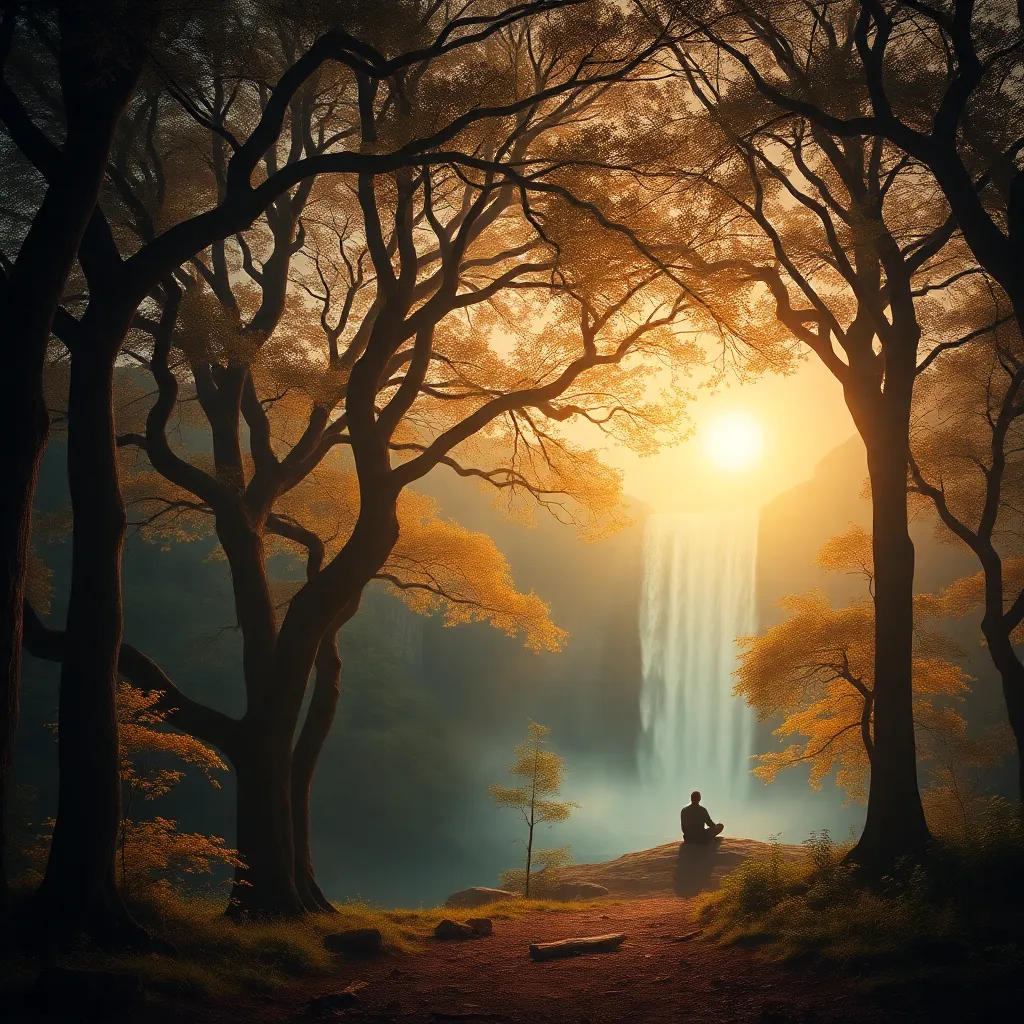 Envision a serene, mystical forest at dawn, where ancient trees with glowing leaves stretch towards a radiant sun. A gentle mist rises, carrying the whispers of ancient wisdom. In the distance, a majestic waterfall cascades, its misty veil shrouding a hidden glade, where a lone figure sits in contemplative silence.