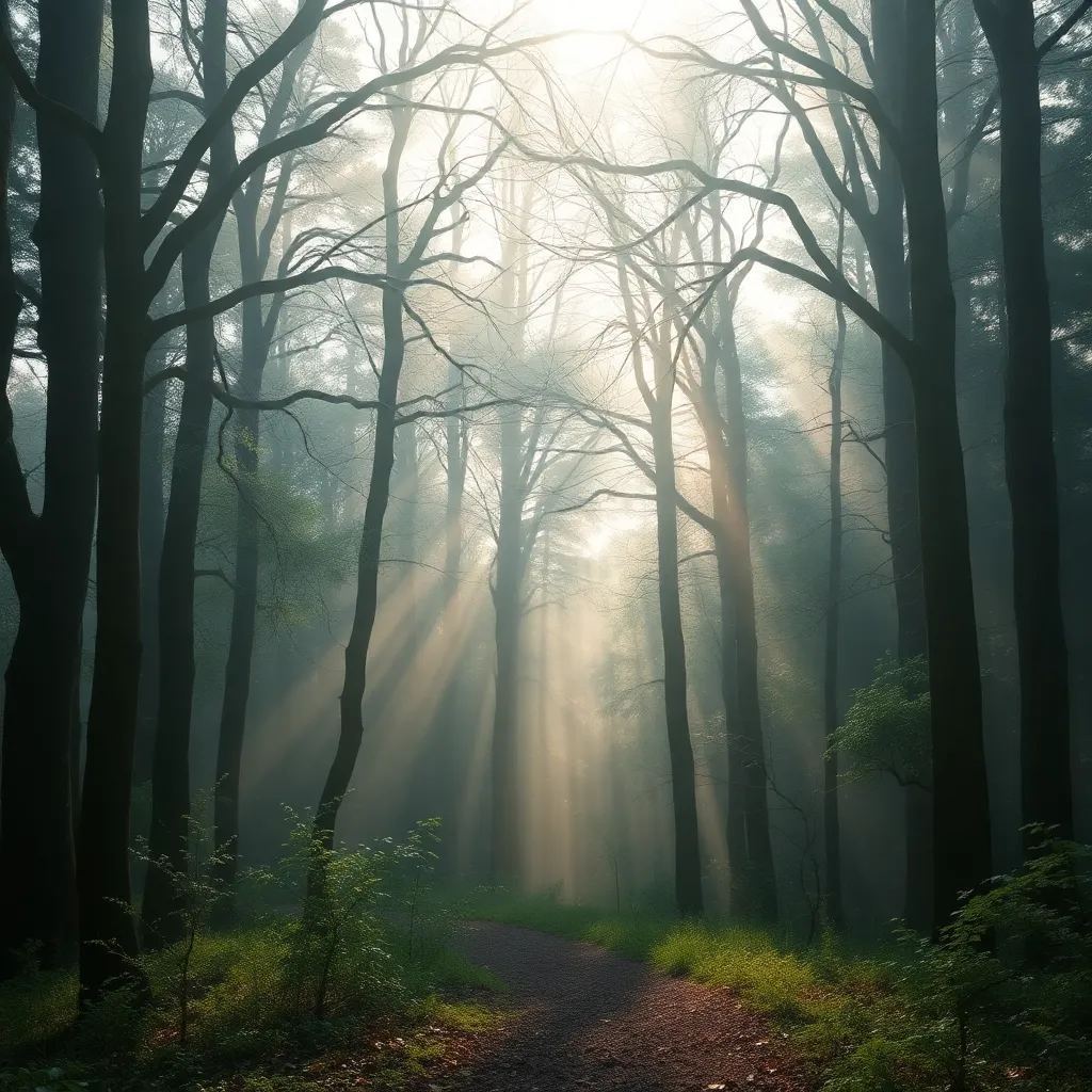 Create an ethereal image of a serene forest glade at dawn, with a faint mist rising from the earth. A gentle beam of light illuminates a majestic tree, its branches stretching towards the sky like arms of devotion. Incorporate subtle, shimmering effects to convey a sense of spiritual connection and peacefulness.