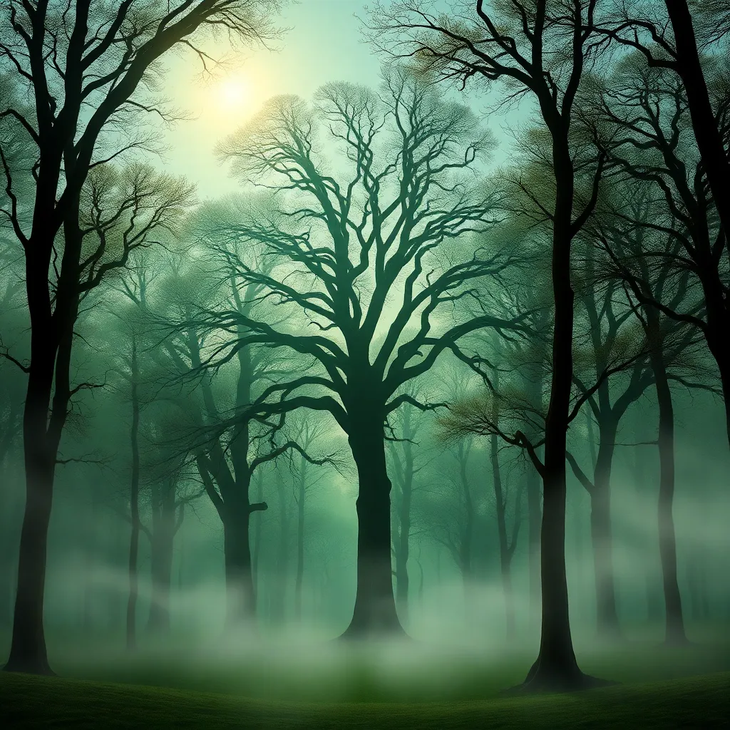 Create an image representing a serene and mystical forest glade, bathed in soft moonlight. A wispy fog rises from the forest floor, carrying the whispers of ancient wisdom. In the center, a majestic tree stands tall, its branches reaching for the stars, symbolizing connection to the divine and the universe.