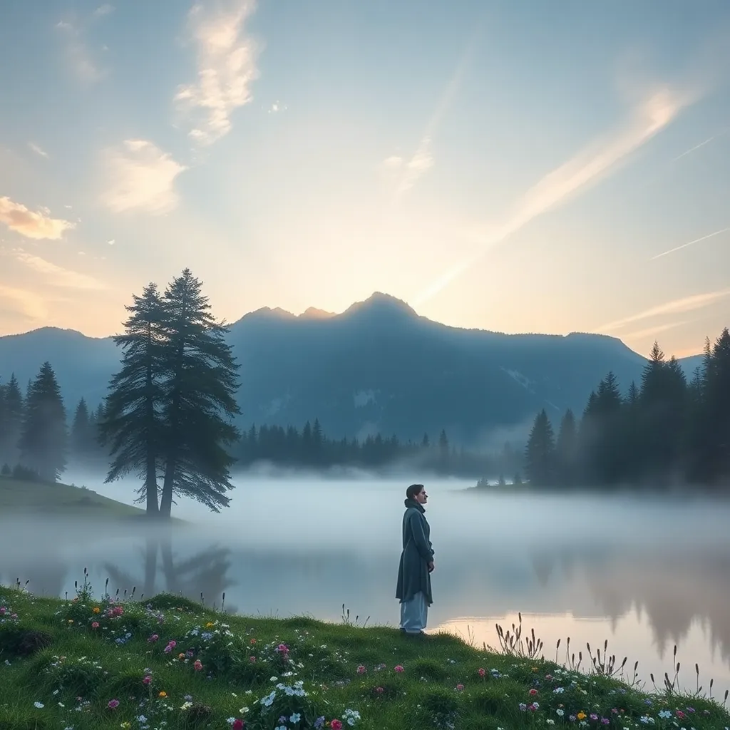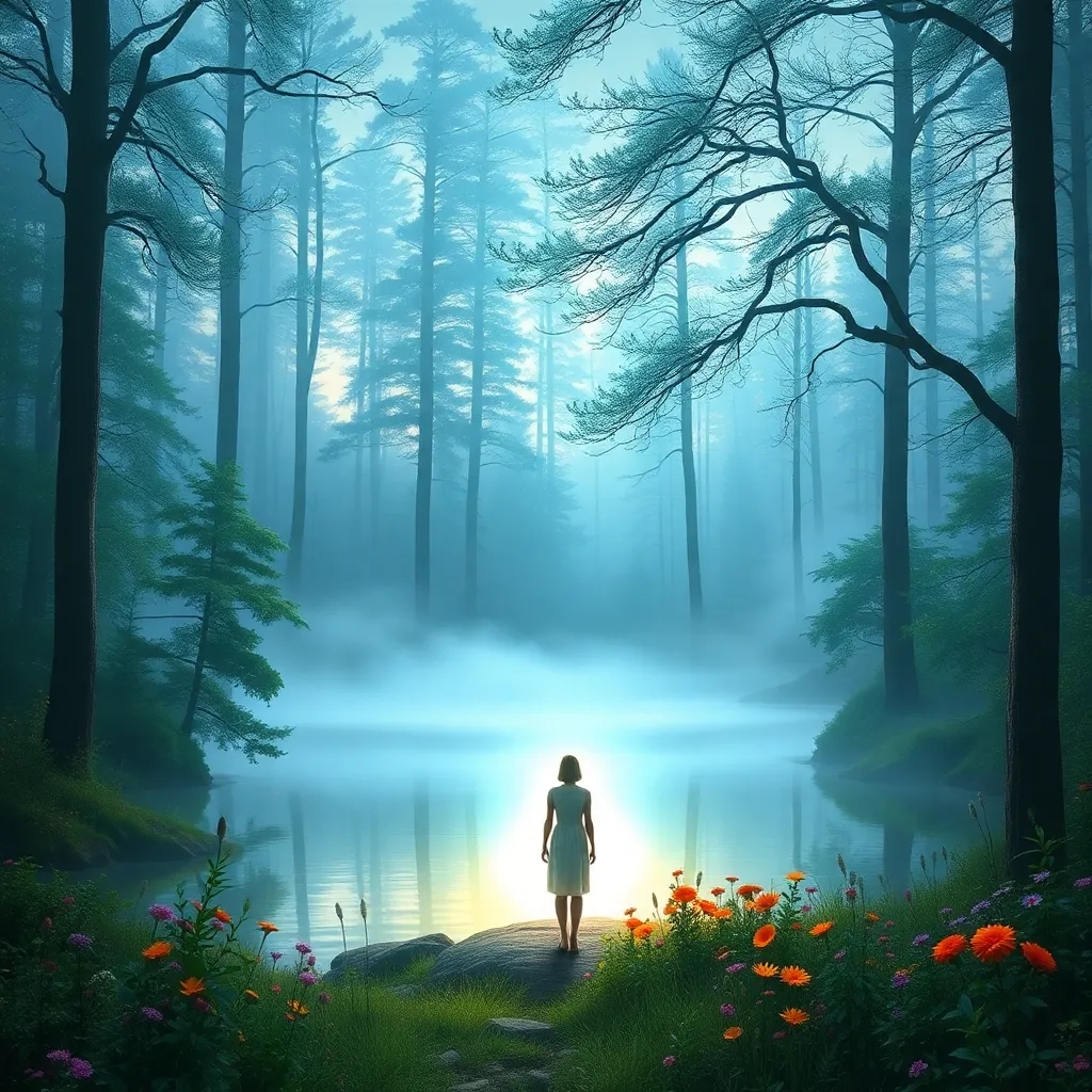 Create an ethereal scene depicting a serene forest glade at dawn, where a figure stands at the edge of a misty lake, surrounded by towering trees and vibrant wildflowers. The atmosphere is tranquil, with a subtle glow emanating from the figure, symbolizing inner peace and connection to nature's spiritual realm.