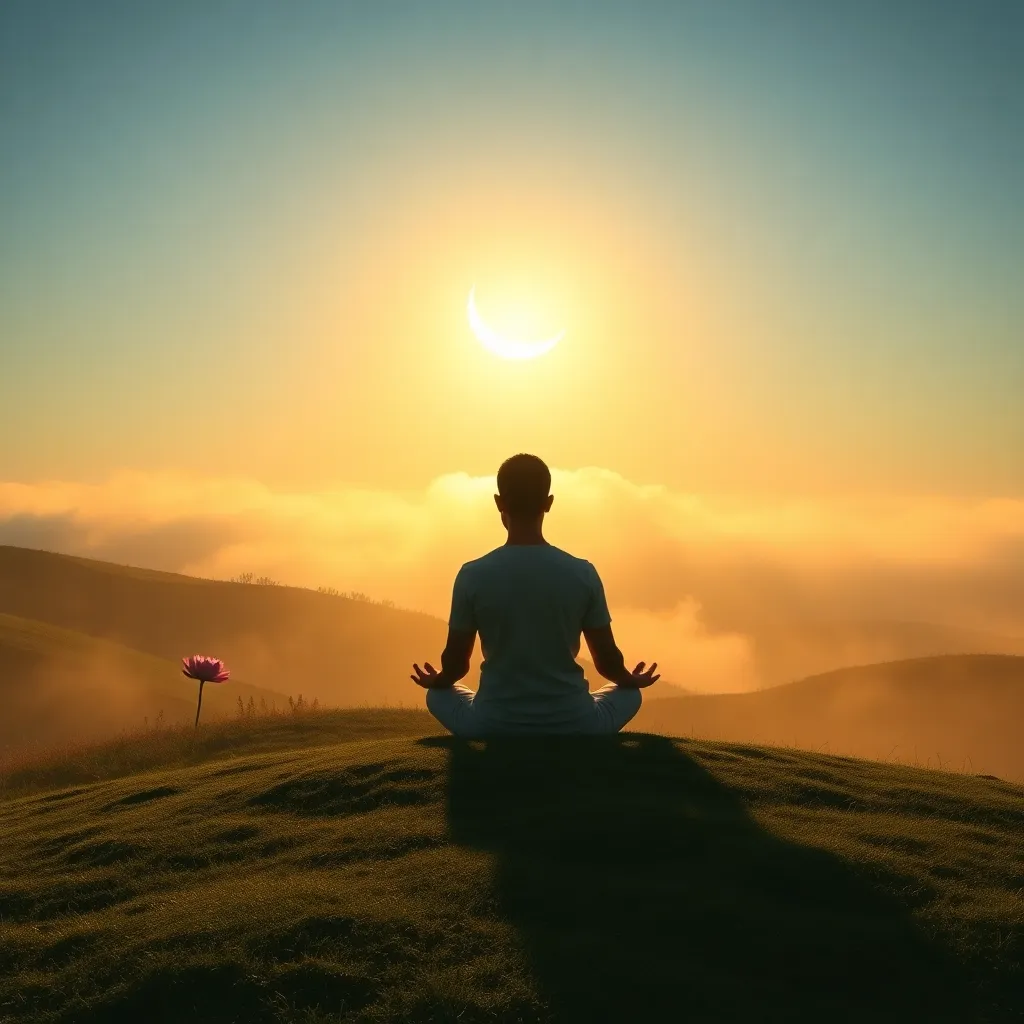 Create an image representing the concept of inner peace. Depict a serene landscape with a person sitting in meditation, surrounded by soft, golden light and gentle mist. Incorporate symbols of spiritual growth, such as a blooming lotus flower or a crescent moon. Use calming colors and soft textures to evoke a sense of tranquility.