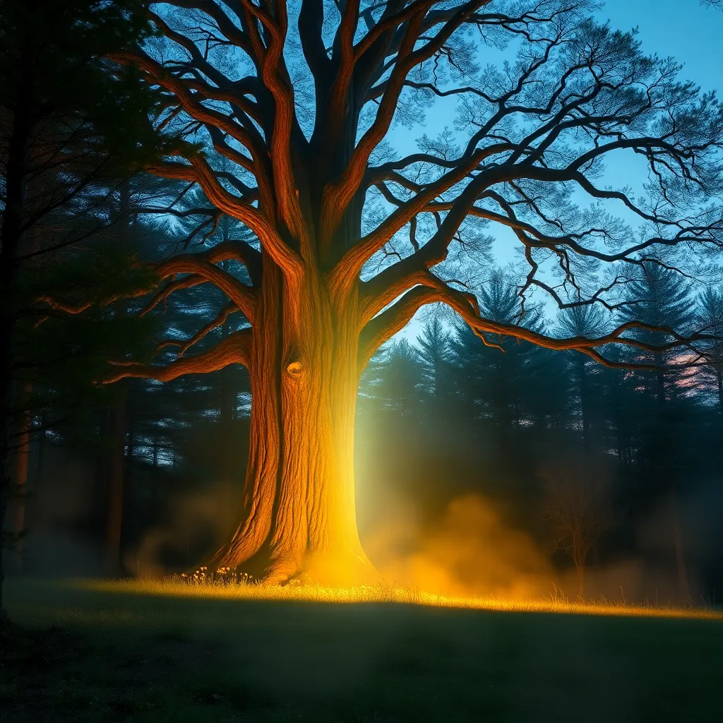 Imagine a serene forest glade at dusk, where a gentle mist rises from the earth. A towering tree, its branches like outstretched arms, reaches for the sky. In its trunk, a glowing aura pulsates with an otherworldly light. The air is filled with the sweet scent of blooming flowers. Capture this mystical scene.