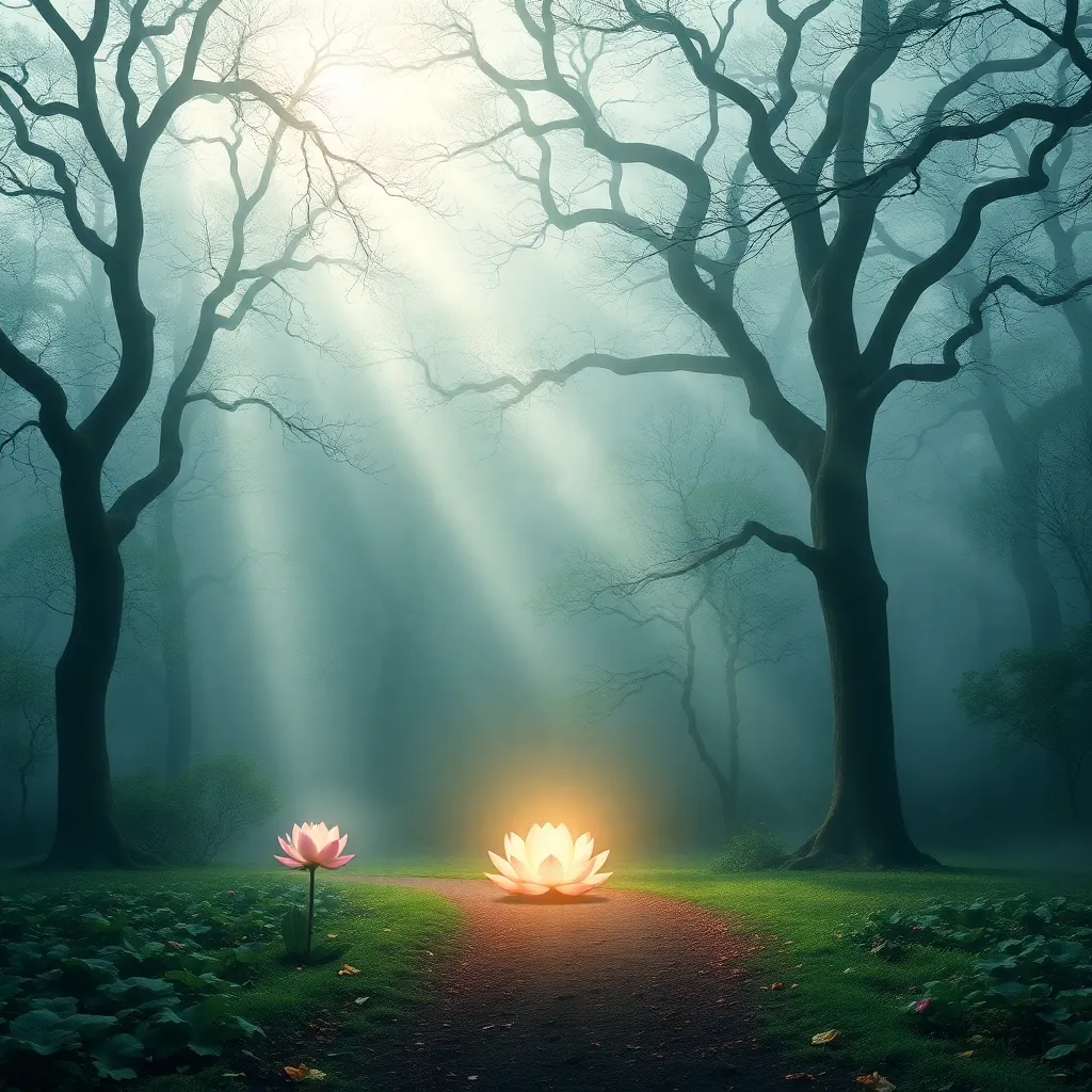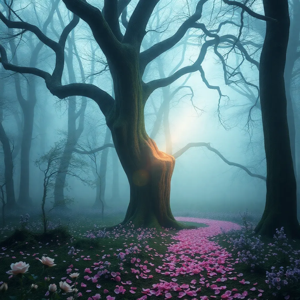 Imagine a serene, misty forest, where ancient trees whisper secrets to the wind. A glowing, iridescent light emanates from within a gnarled tree trunk, illuminating a path of rose petals leading to a hidden clearing. The air is filled with the sweet scent of blooming lavender. What spiritual message does this scene convey?