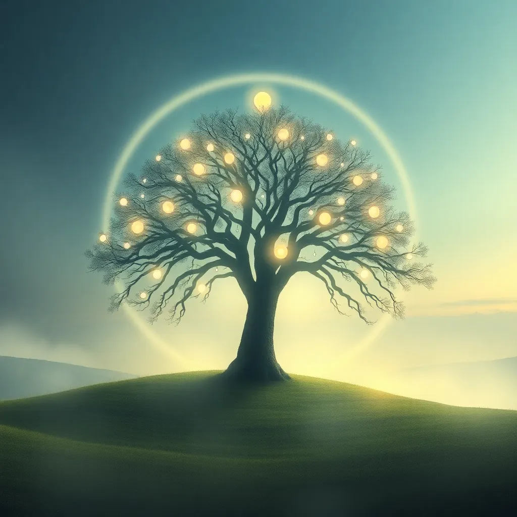 Imagine a serene landscape with a majestic tree of life at its center, surrounded by a halo of soft, ethereal light. The tree's branches stretch towards the sky, adorned with glowing orbs that represent the interconnectedness of all things. The atmosphere is peaceful, with a subtle mist of spiritual energy.