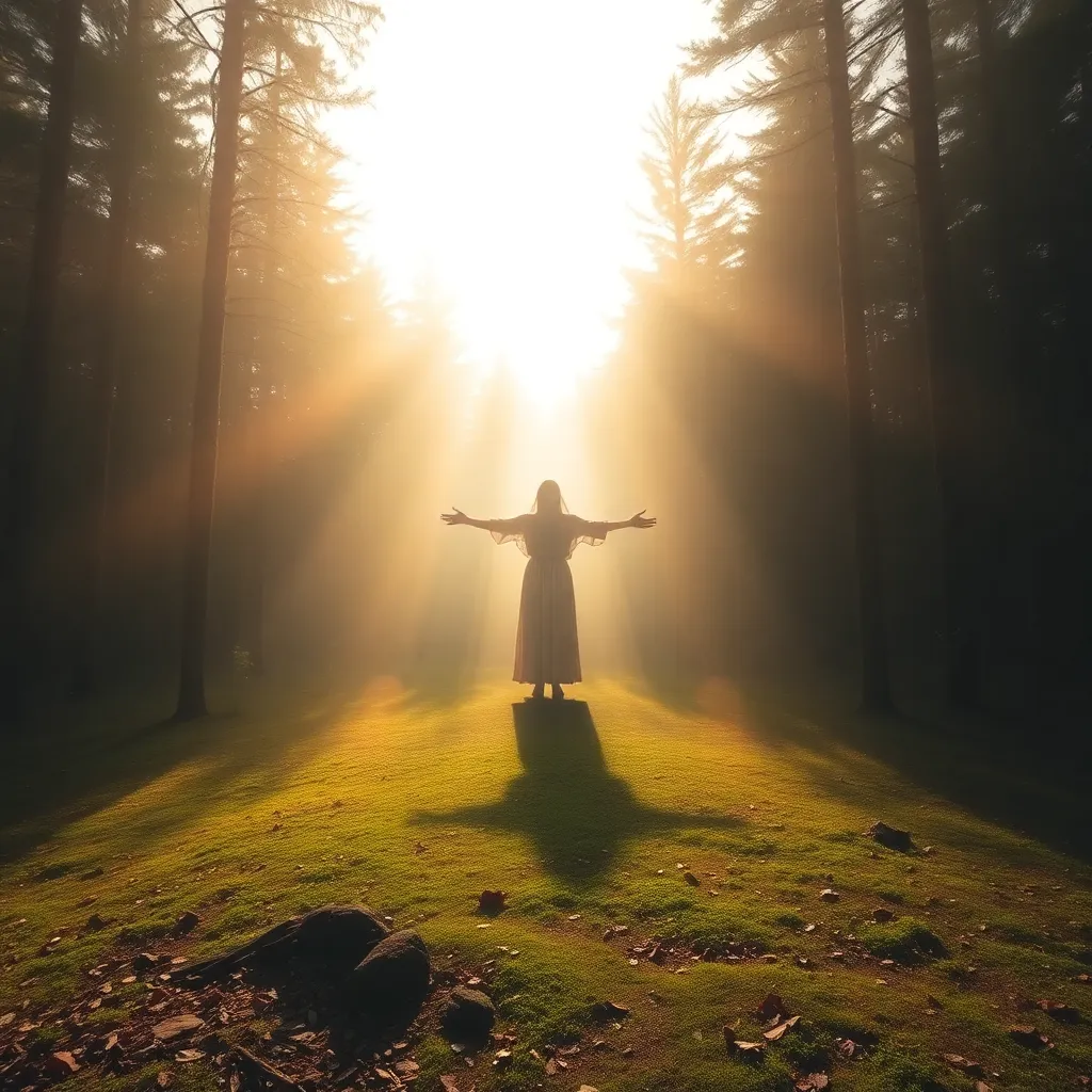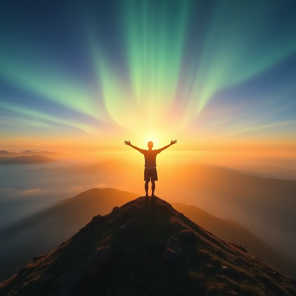 Envision a serene landscape at dawn, where a lone figure stands atop a hill, surrounded by misty mountains and a radiant aurora. The figure is bathed in a warm, golden light, with outstretched arms embracing the sky. The image should evoke a sense of inner peace, connection to the universe, and spiritual awakening.