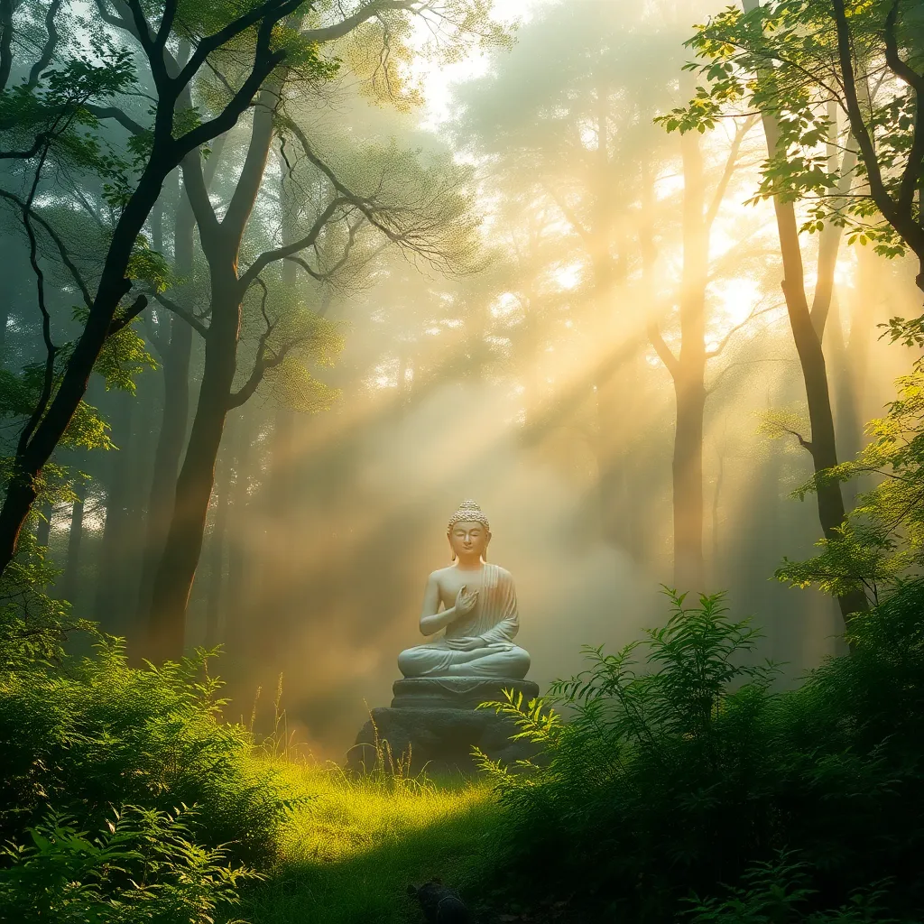 Create an ethereal scene depicting a serene forest glade at dawn. A misty veil lifts to reveal a glowing Buddha statue surrounded by lush greenery. Soft, golden light filters through the trees, illuminating the air with an otherworldly aura. Incorporate subtle, swirling patterns to convey a sense of spiritual energy.