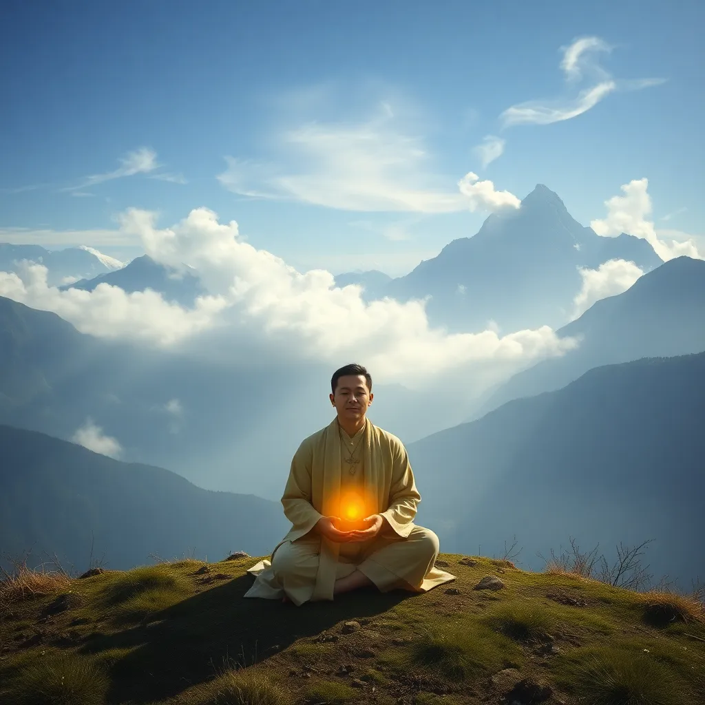 Imagine a serene mountain retreat where a lone figure sits in contemplative silence, surrounded by wispy clouds and towering peaks. The air is filled with the sweet scent of incense, and a soft, ethereal glow emanates from the figure's hands. What is the figure's expression, and what symbols adorn their attire?