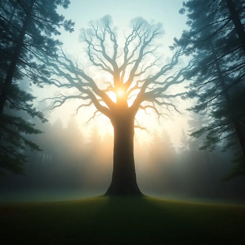 Create an ethereal scene depicting a serene forest glade at dawn. A gentle mist rises from the forest floor, carrying the whispers of ancient wisdom. A majestic tree, its branches reaching for the sky, serves as a gateway to the spiritual realm. Incorporate soft, luminescent colors and subtle, shimmering lights.