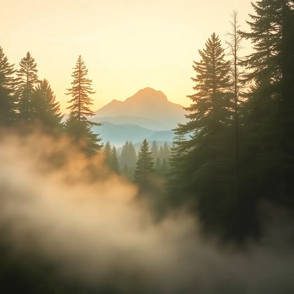 Create an image of a serene forest at dawn, with a subtle glow emanating from the trees. A wispy mist rises from the forest floor, carrying the whispers of ancient wisdom. In the distance, a majestic mountain range rises, symbolizing spiritual growth and connection to the universe. Incorporate soft, ethereal colors.