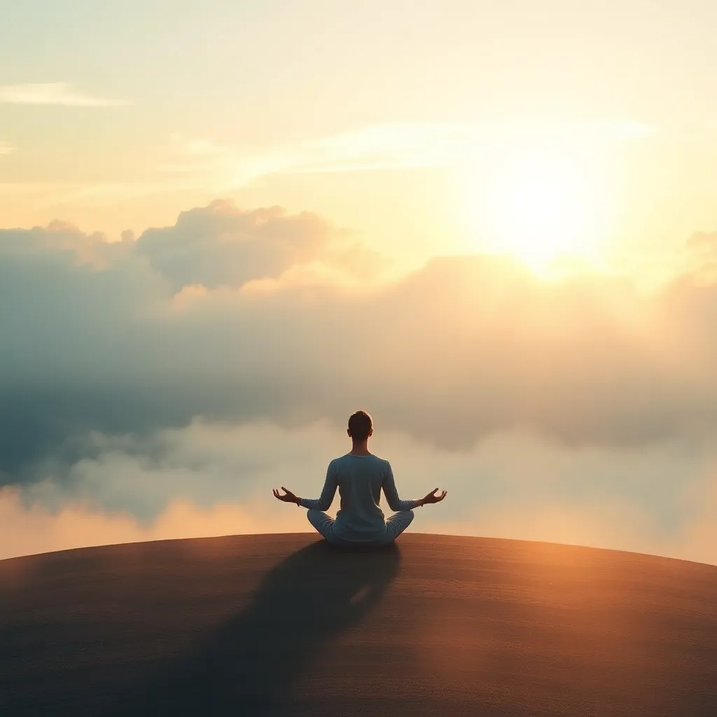 Create an image that represents the concept of 'inner peace'. Depict a serene landscape with a person sitting in a lotus position, surrounded by gentle clouds and soft, warm lighting. Incorporate subtle wisps of mist to convey a sense of clarity and tranquility, evoking feelings of calm and spiritual connection.