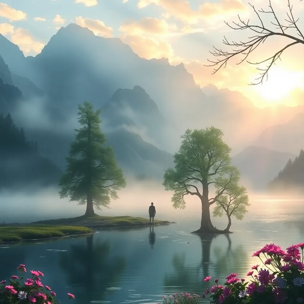 Imagine a serene landscape at dawn, with a misty lake reflecting the vibrant hues of a sunrise. In the distance, a majestic tree stands tall, its branches adorned with glittering fairy lights, symbolizing the connection between nature and the divine. The air is filled with the sweet scent of blooming flowers.