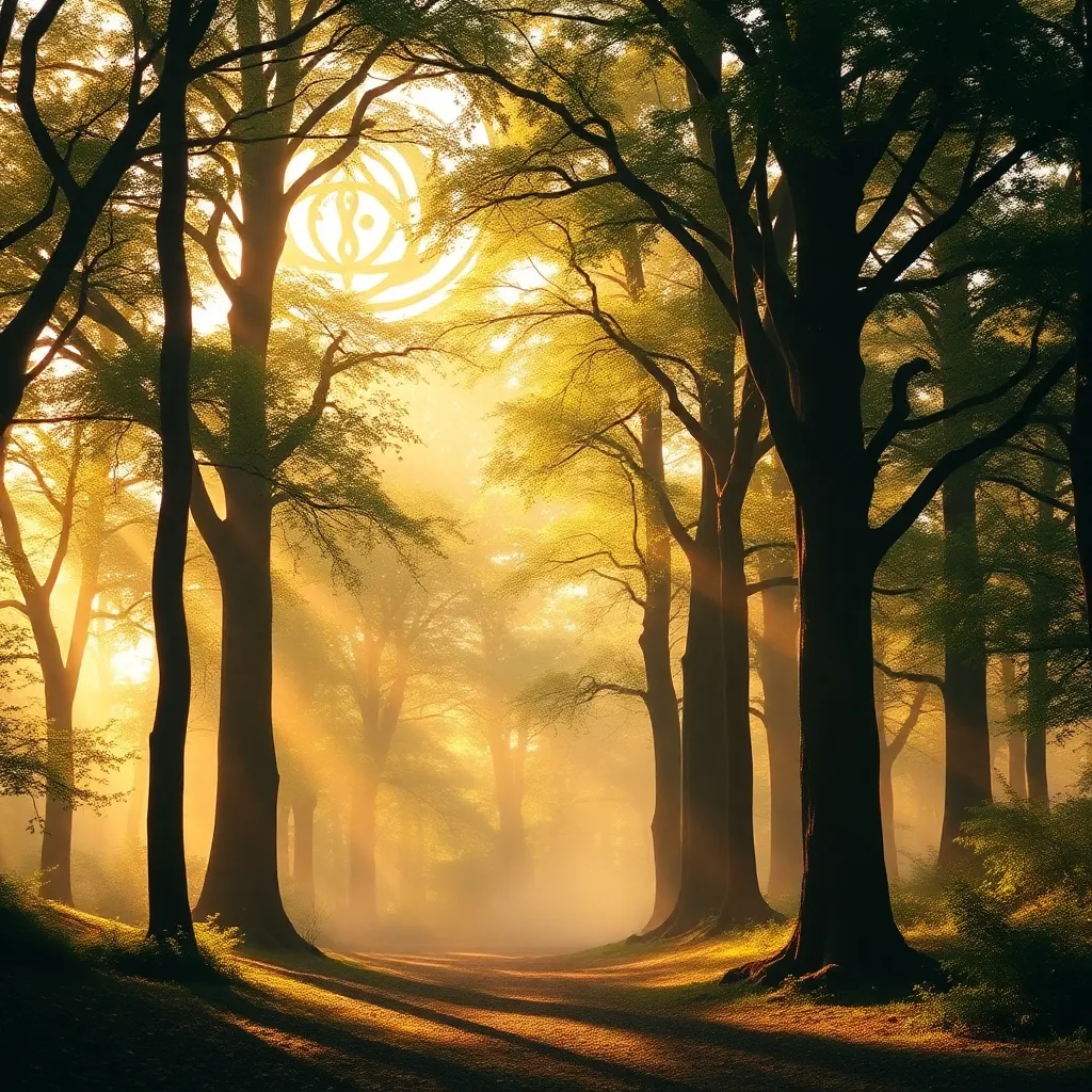 Create an image of a serene and peaceful forest glade, bathed in a warm, golden light. The trees are adorned with intricate, swirling patterns that resemble ancient symbols of spiritual growth. A misty veil rises from the earth, carrying the whispers of ancient wisdom. The atmosphere is one of tranquility and connection to the divine.