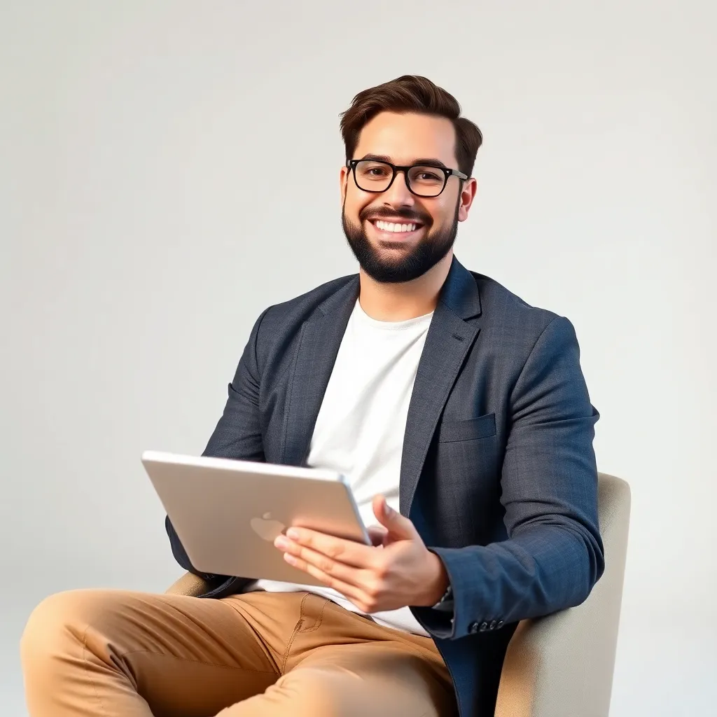 Create a professional headshot for a startup founder. The image should convey confidence, innovation, and approachability. Consider a minimalist background, a slight smile, and a relaxed yet engaged pose. Incorporate subtle startup-themed props, such as a laptop or a tablet, to add context and personality to the portrait.
