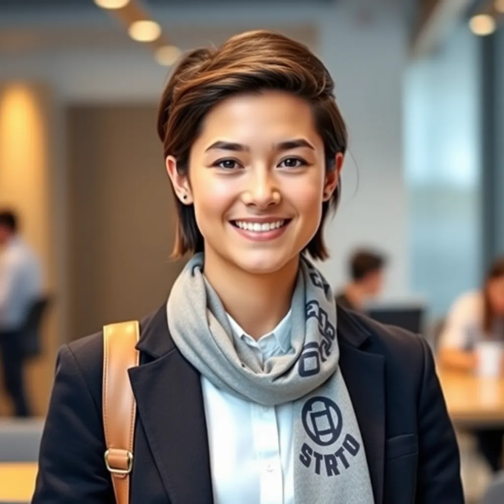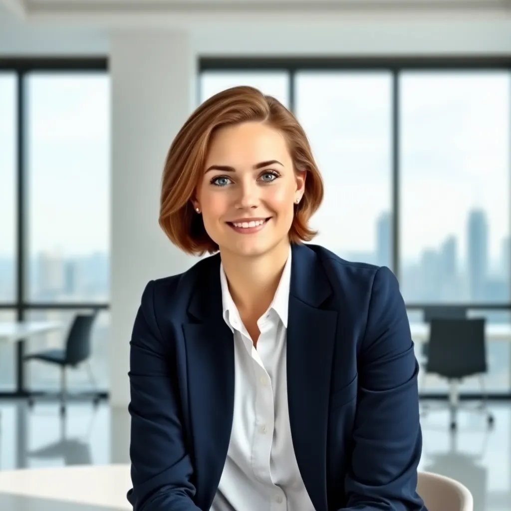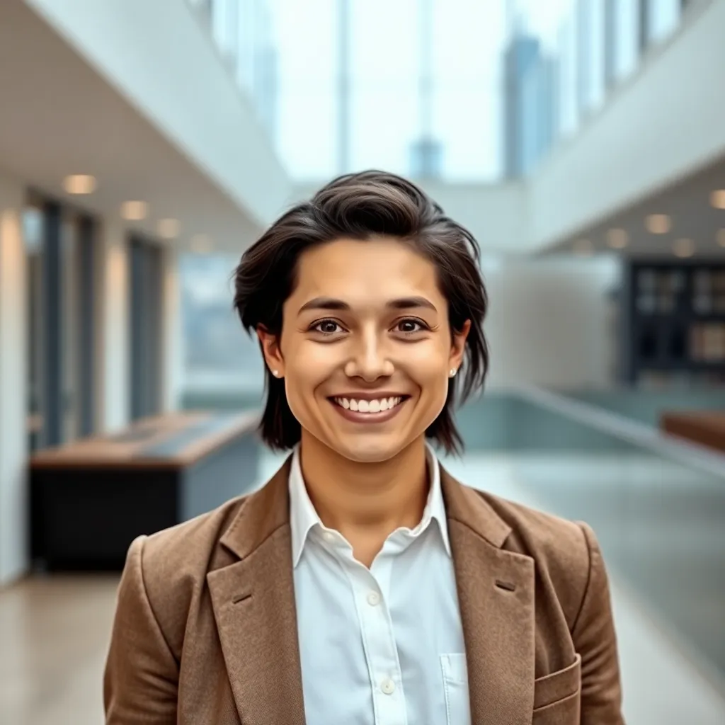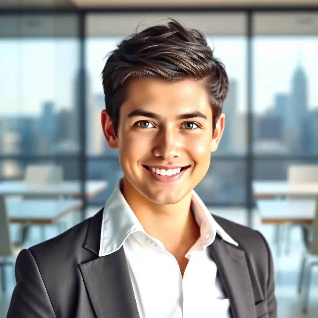 Create a professional headshot for a startup founder. The founder is a young, ambitious entrepreneur with short, dark hair and bright blue eyes. They're dressed in a crisp white shirt and a blazer, with a warm and approachable smile. The background is a modern, minimalist office space with a city skyline.