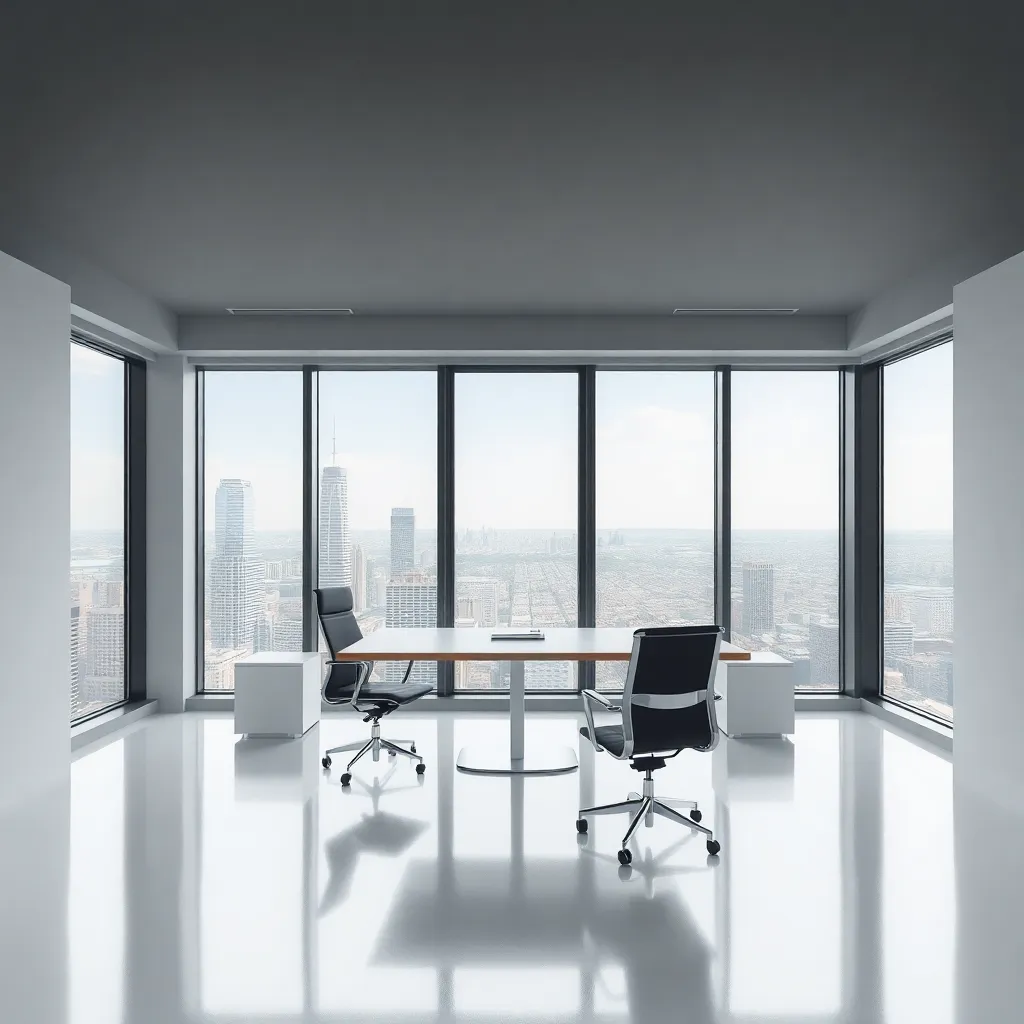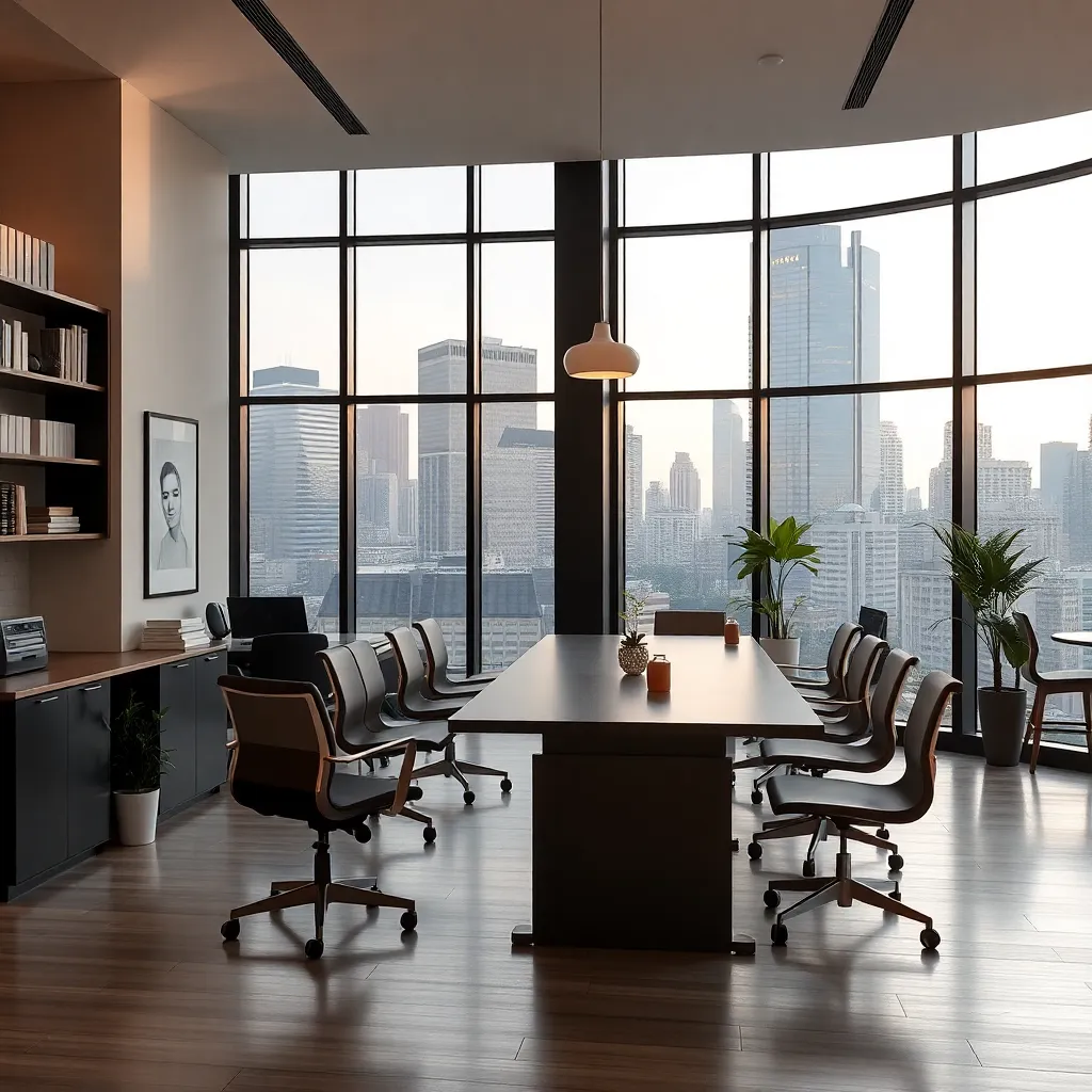 Create a professional headshot for a startup founder. The subject is a 35-year-old entrepreneur with short brown hair and a friendly smile. They're dressed in a modern outfit with a subtle pattern. The background is a minimalist office space with a cityscape outside the window. Capture their confident and approachable demeanor.